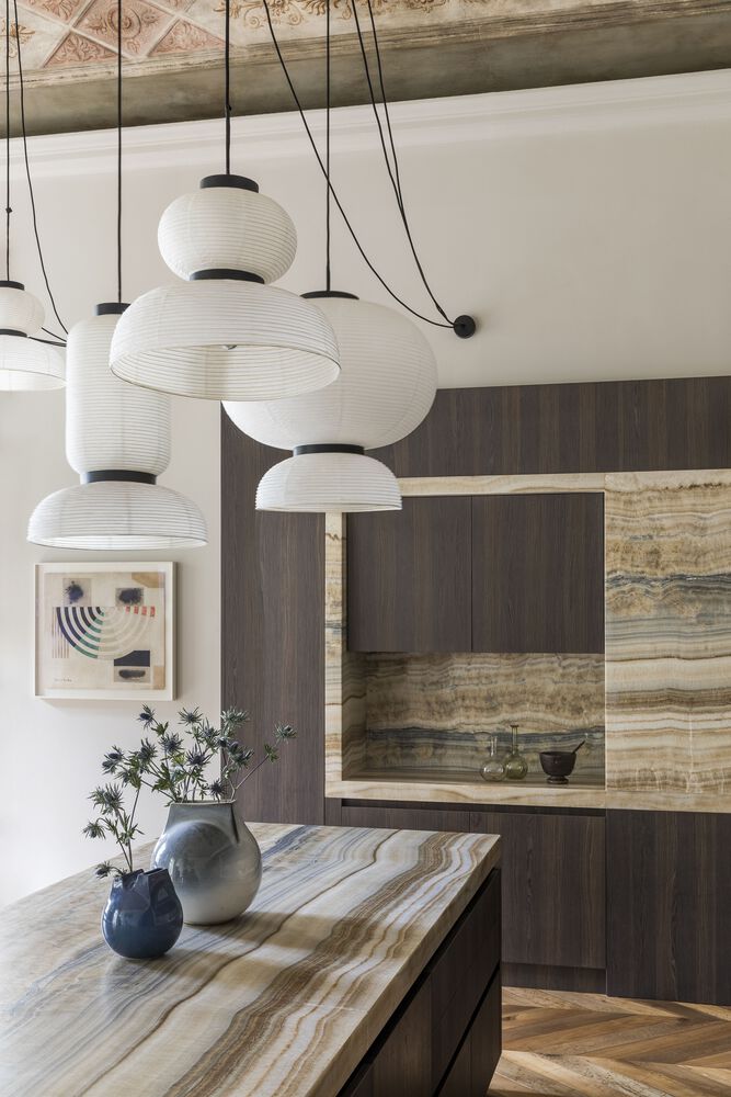 The kitchen is entirely custom-made with sartorial precision. The paneling alternates Alpi Smoked Oak with carefully selected Velvet Onyx slabs, which are positioned to reveal the continuity of their original veining.