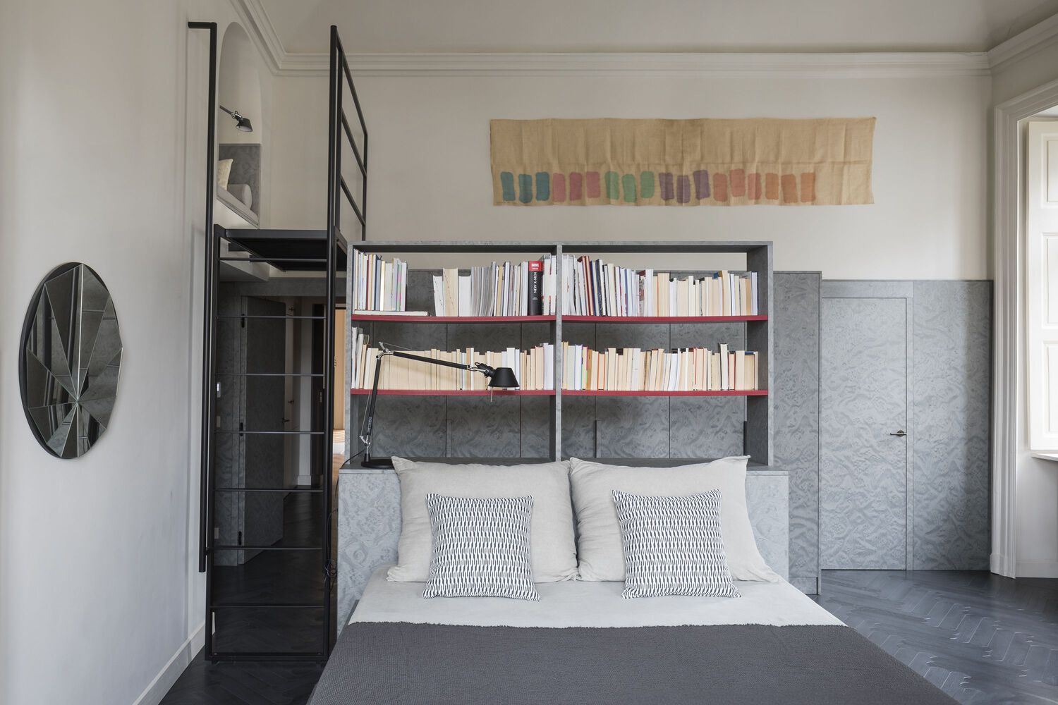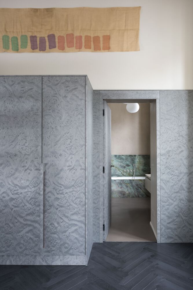 In the son's bedroom, the custom-made furniture is made of grey briarwood, while on the floor, a custom version of Listone Giordano's Biscuit parquet floor is applied. On the back wall, a niche that emerged during the renovation works has been transformed into a small suspended alcove.
