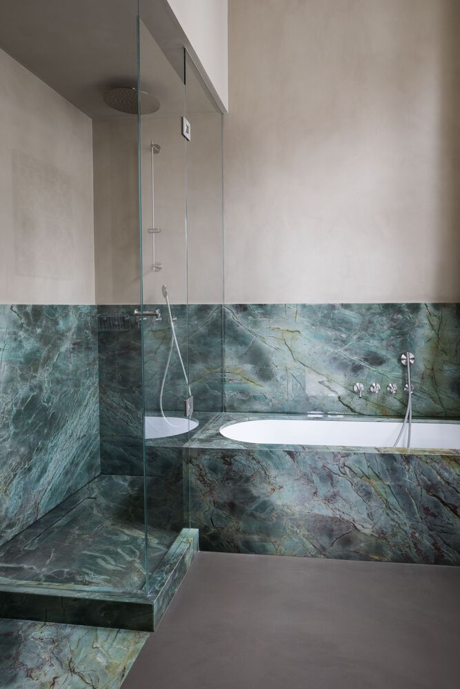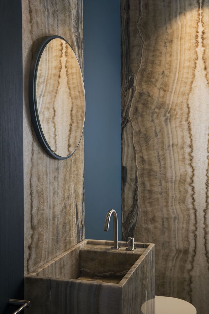 In the bathrooms, all the versatility of marble and onyx's expressive potential unfolds, with surprising colours and refined cuts, skillfully handcrafted by the historic Turin manufacturer Sommo Marmi.