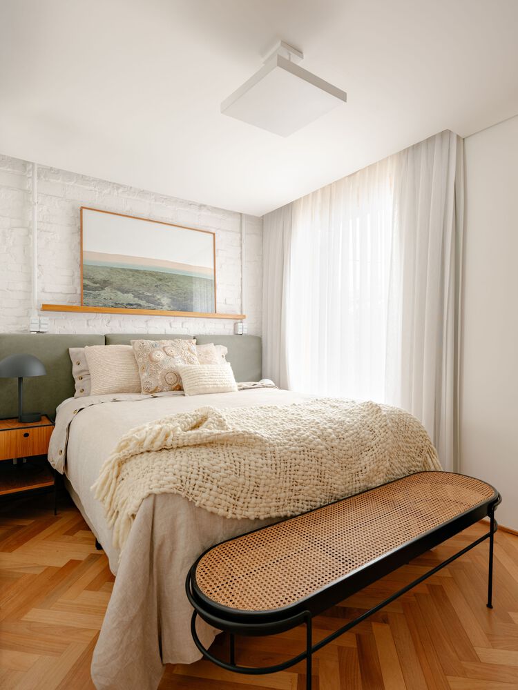 The brick texture was highlighted when the layer of plaster was removed from the original walls. The Tauari wood floor is herringbone pattern paginated. The doors in Freijó wood go up to the ceiling with integrated handles, bringing in a sensation of higher walls.