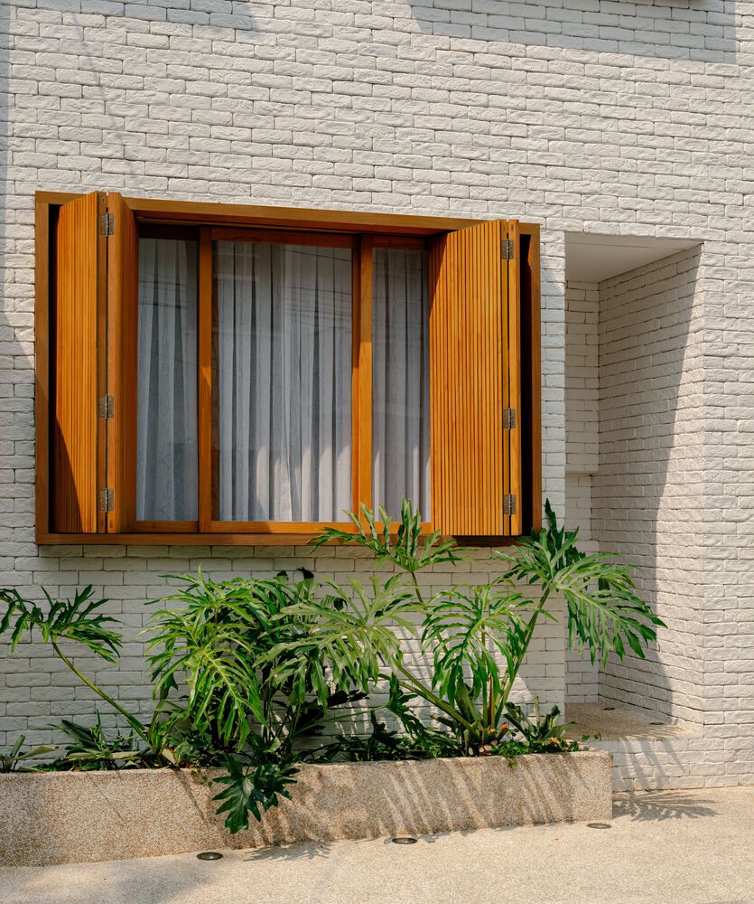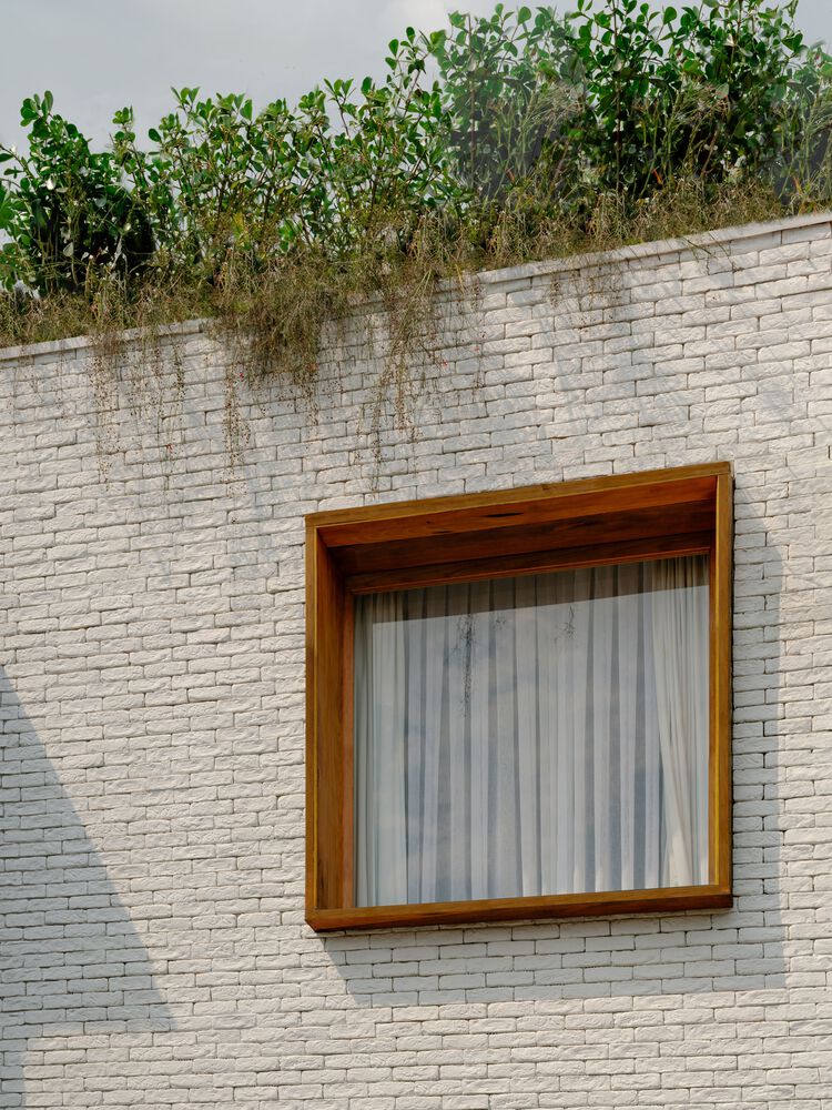 The stairs are in a folded metal sheet with railings in perforated metal that connect the floors. On the other hand, the herringbone Tauari wood floor and the frames in Freijó wood bring warmth to the house. White bricks, frames in Freijó wood, and slatted venetians design the façade and welcome passers-by.