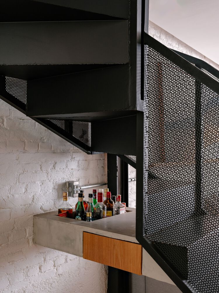 Underneath the staircase, we designed a concrete bar, continuing on from the stair treads, at the clients' request, for them to use when entertaining friends.