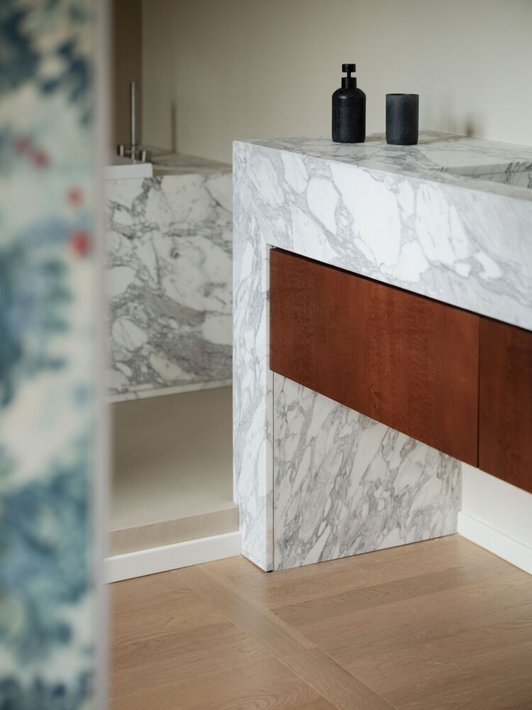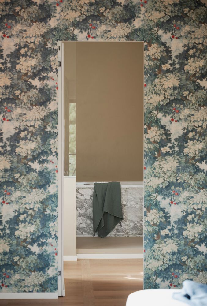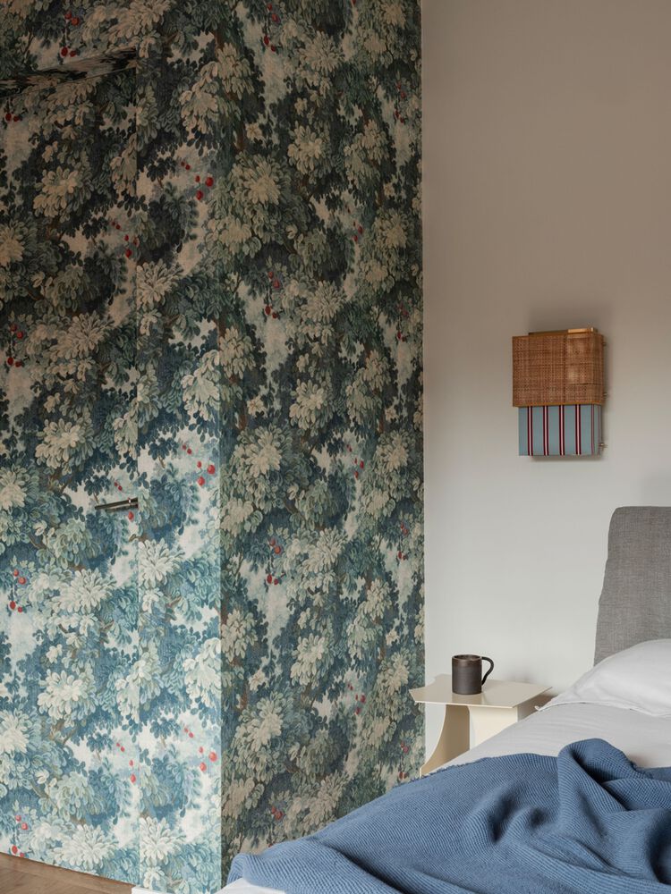 In the master bedroom, a wall clad in Colony wallpaper conceals the entrance to the en suite bathroom—a luxurious haven featuring a freestanding tub and an integrated Arabescato marble sink.