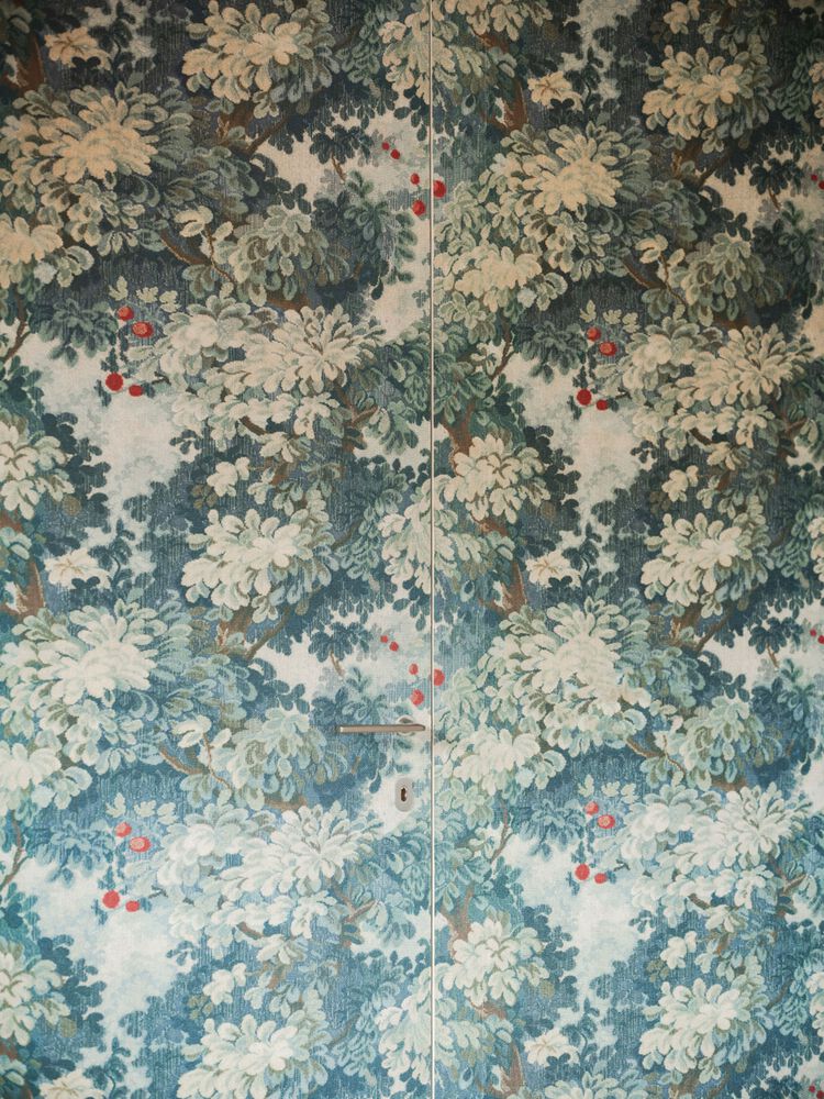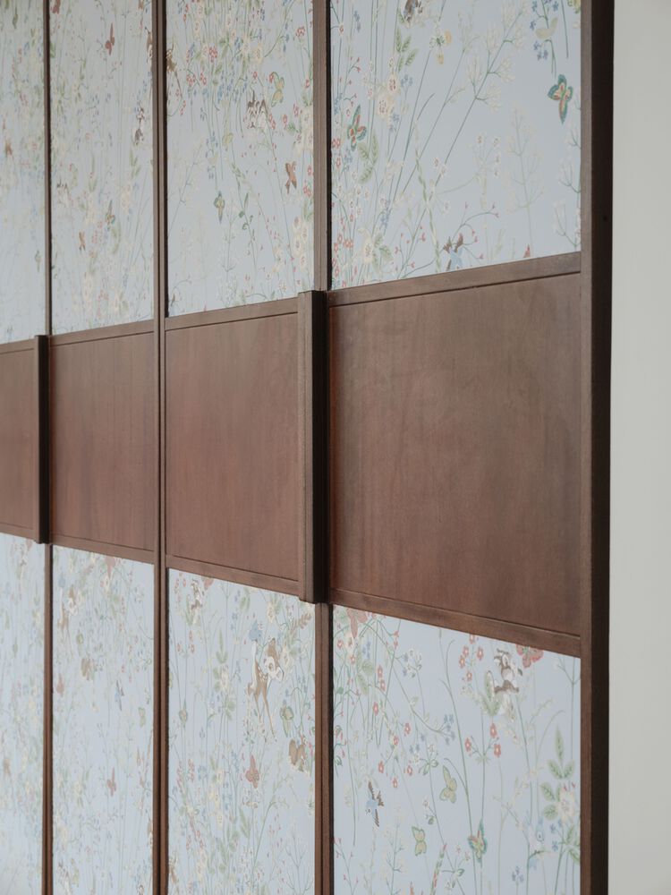 At the entrance, a custom-made wardrobe lined with "Viceversa Monet" fabric by L'Opificio, featuring elegant Tanganika walnut trim, showcases STUDIOTAMAT's meticulous craftsmanship, reflecting their approach to creating refined, timeless interiors.