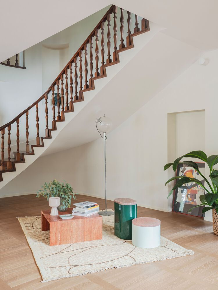 Upstairs, the oak parquet floors laid in a "sister" pattern connect the bedrooms, each overlooking the main staircase and joined by a continuous cream-colored resin path.
