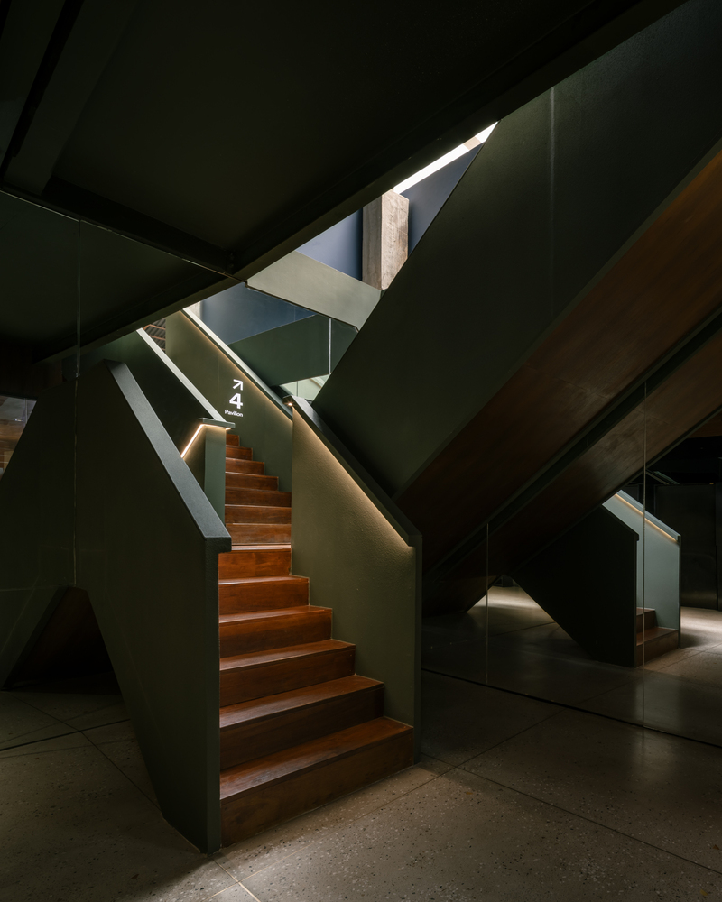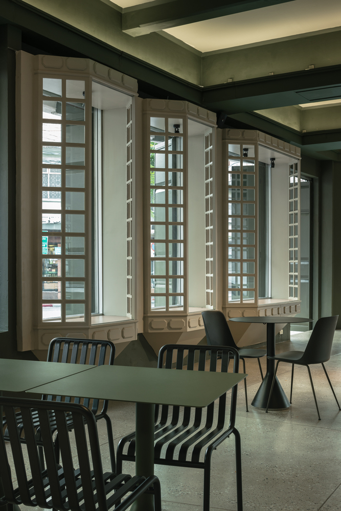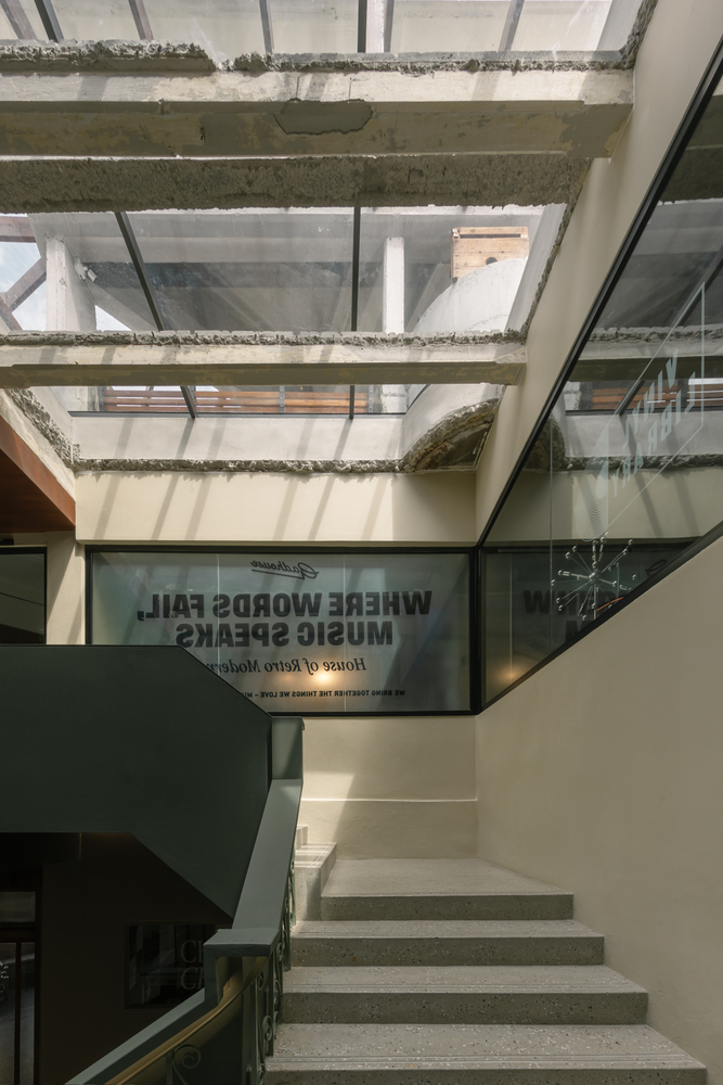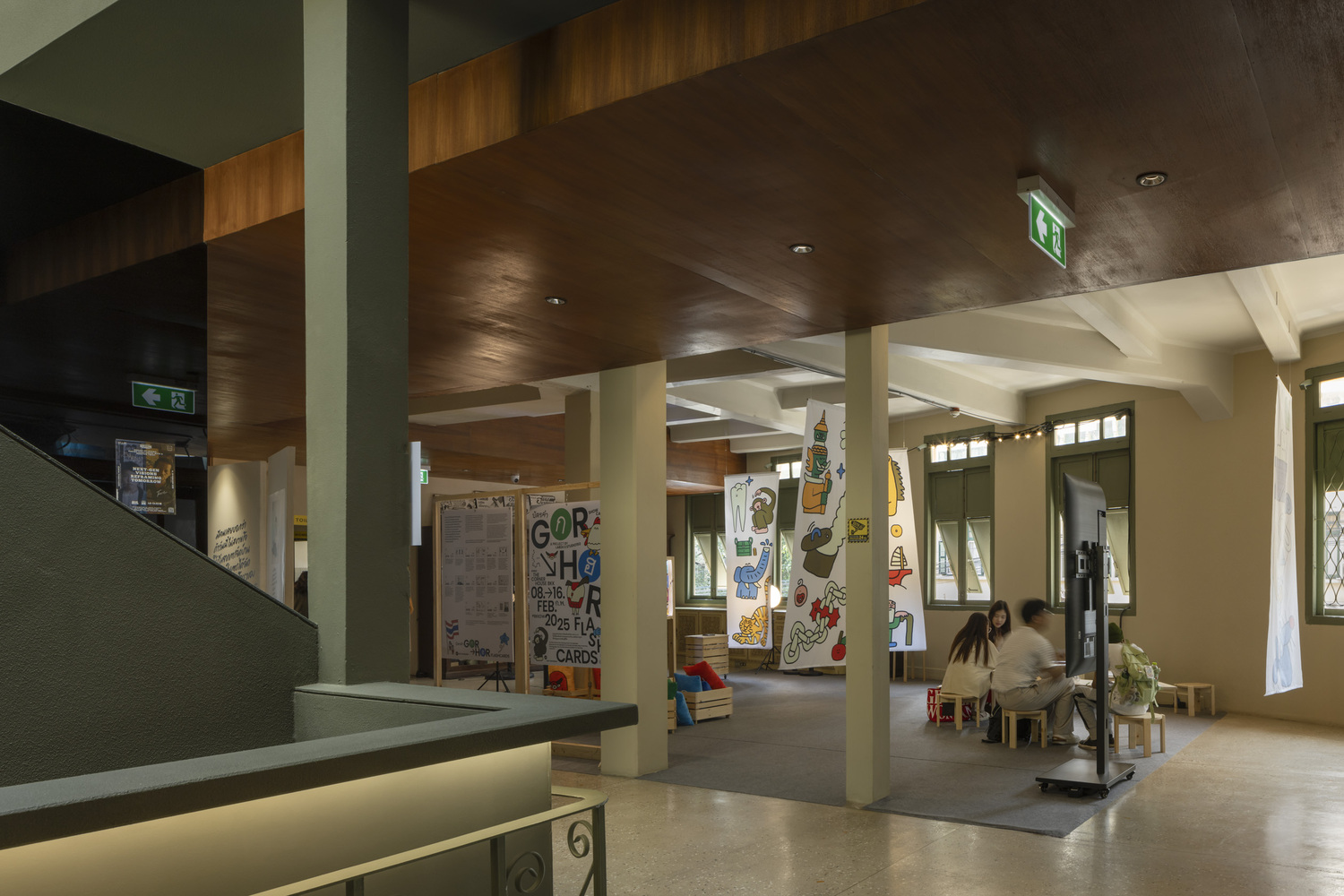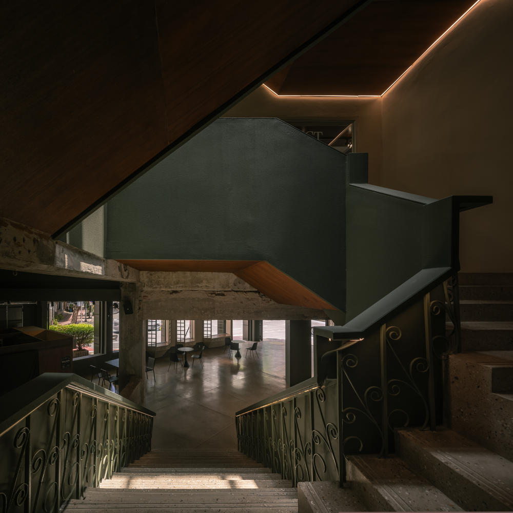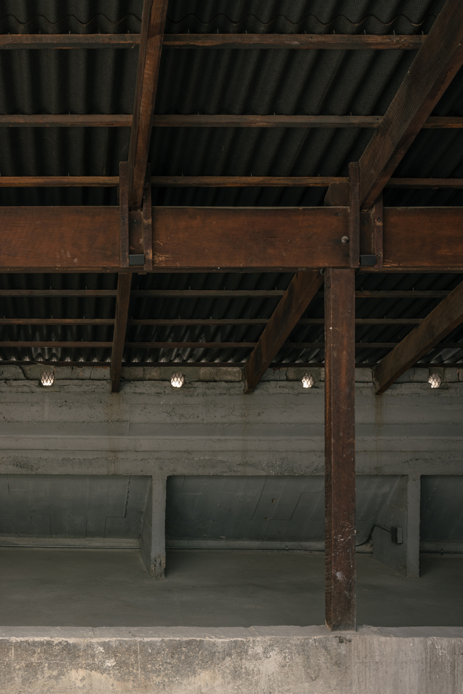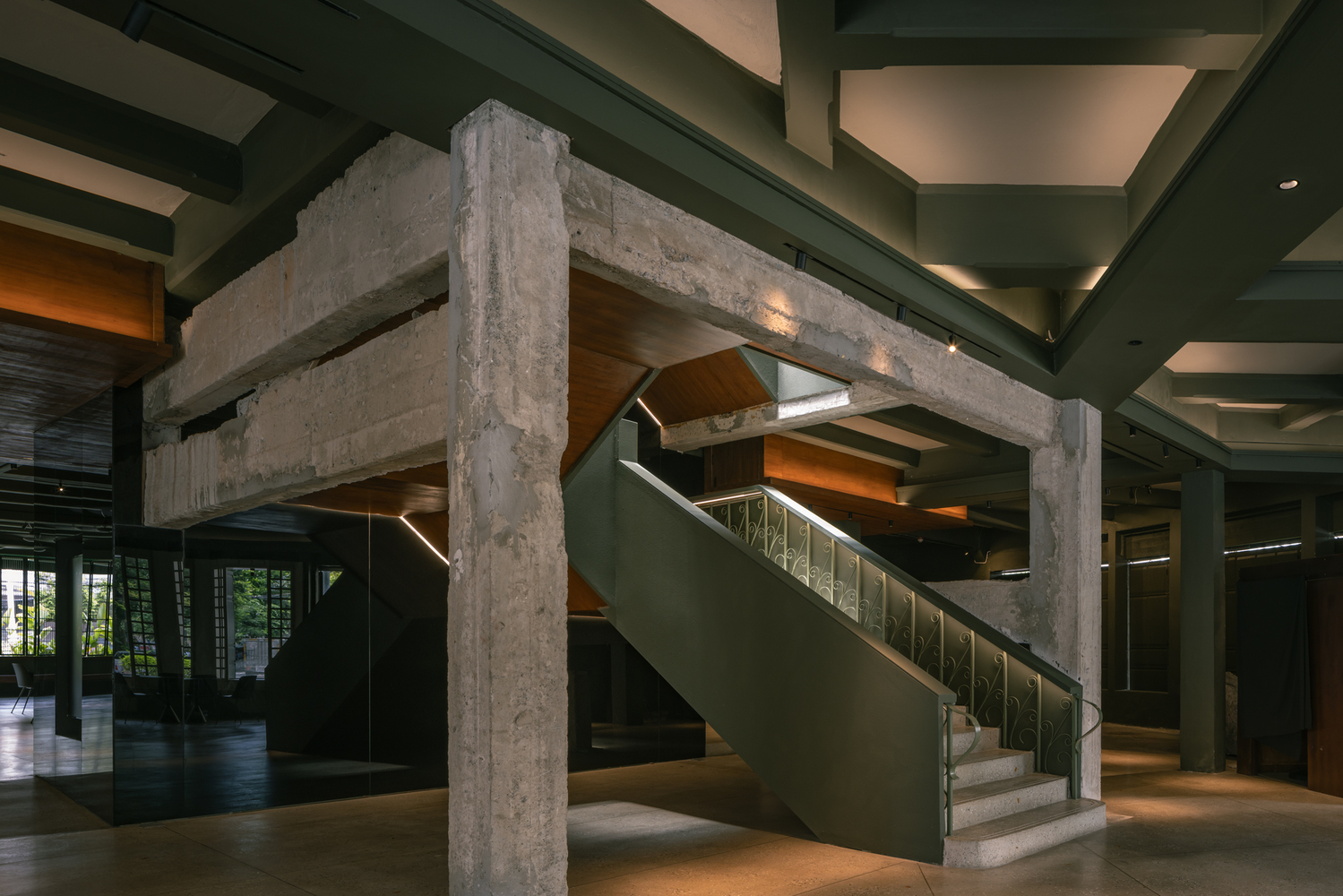 nside the ground floor of the building, we preserved the original concrete beam structure and enhanced the charm of the existing ceiling with carefully arranged lighting.