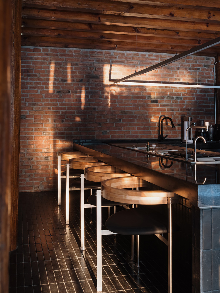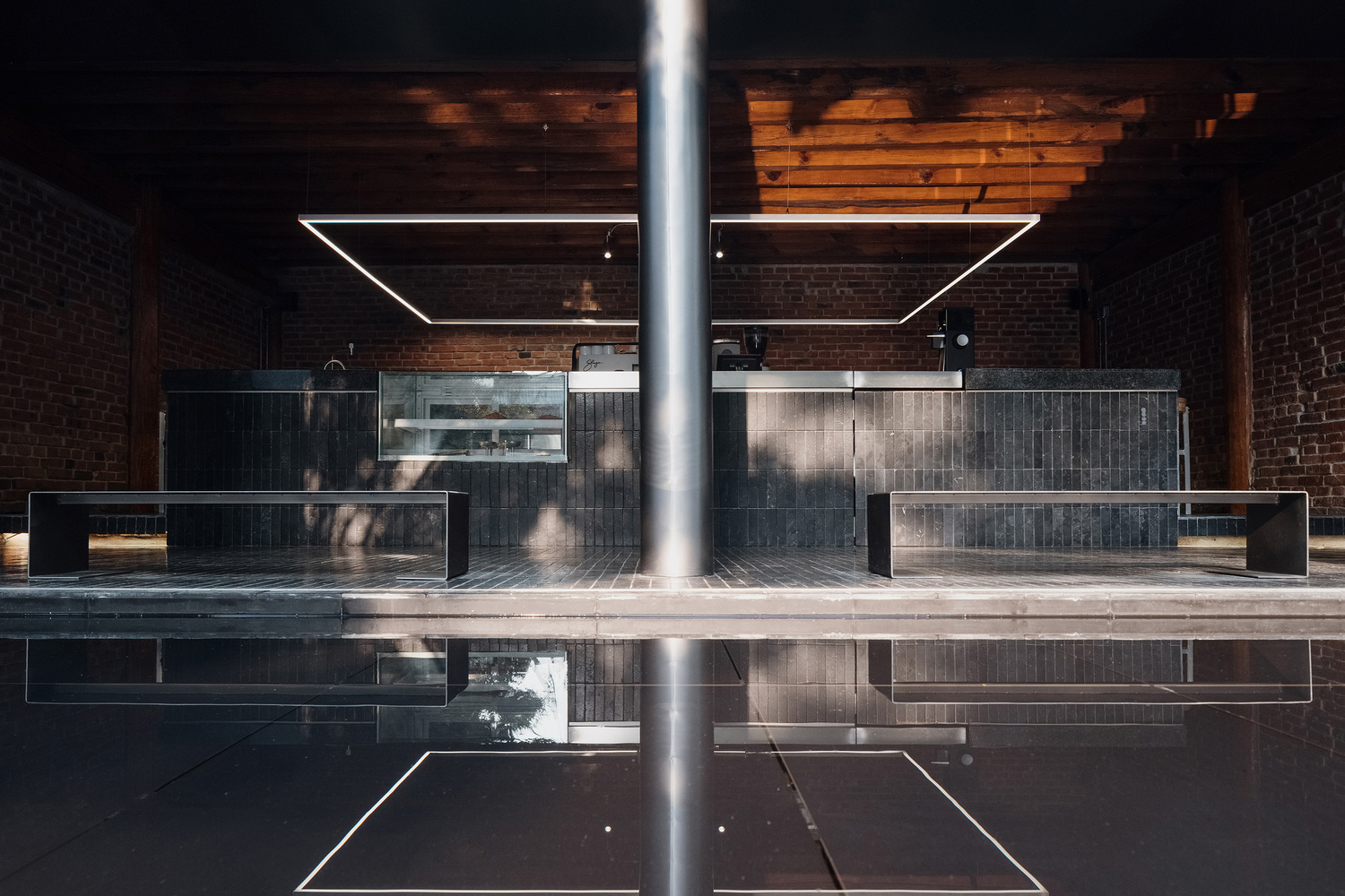 The bar facing the north seating area is dedicated to pour-over coffee preparation, while the bar facing the south seating area specializes in artisanal drinks.