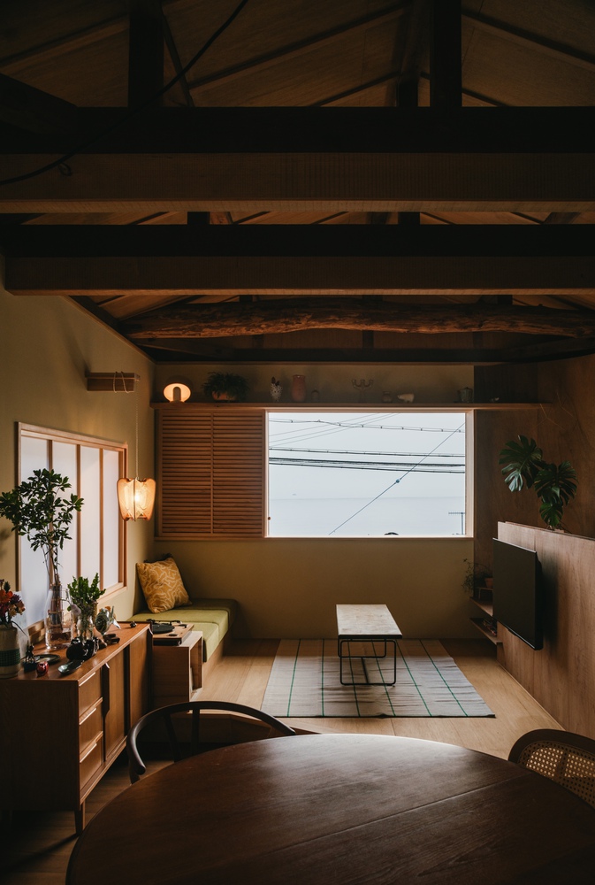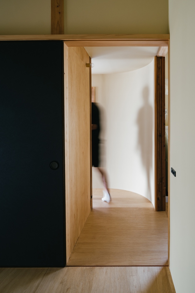 Out of this process emerged geometric qualities: curved walls to conceal piping, low ceilings with semicircular cutouts, and sliding doors reused from old Fusuma.