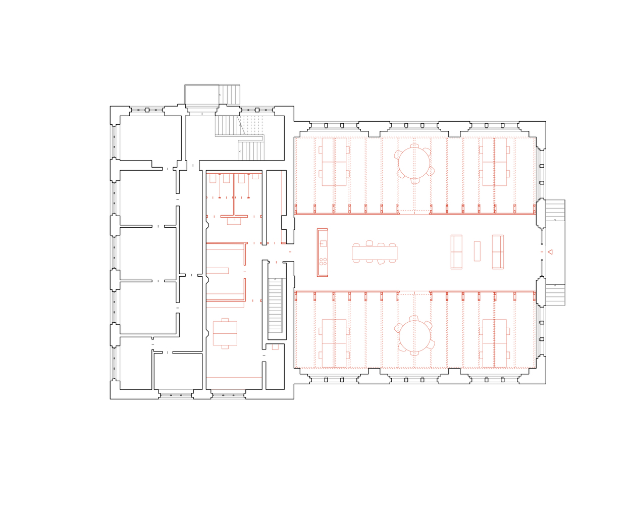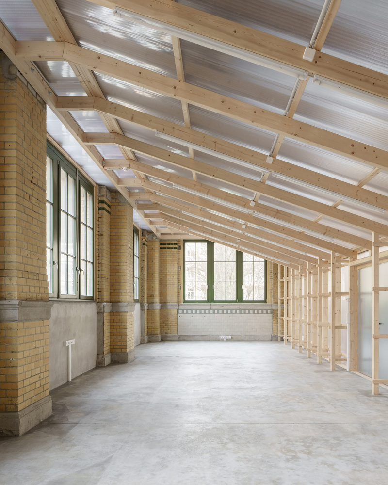 Both the hall and other parts of the building have been converted into workshop and office spaces, while its historic structure has been preserved, and its outer shell has been renovated only selectively.