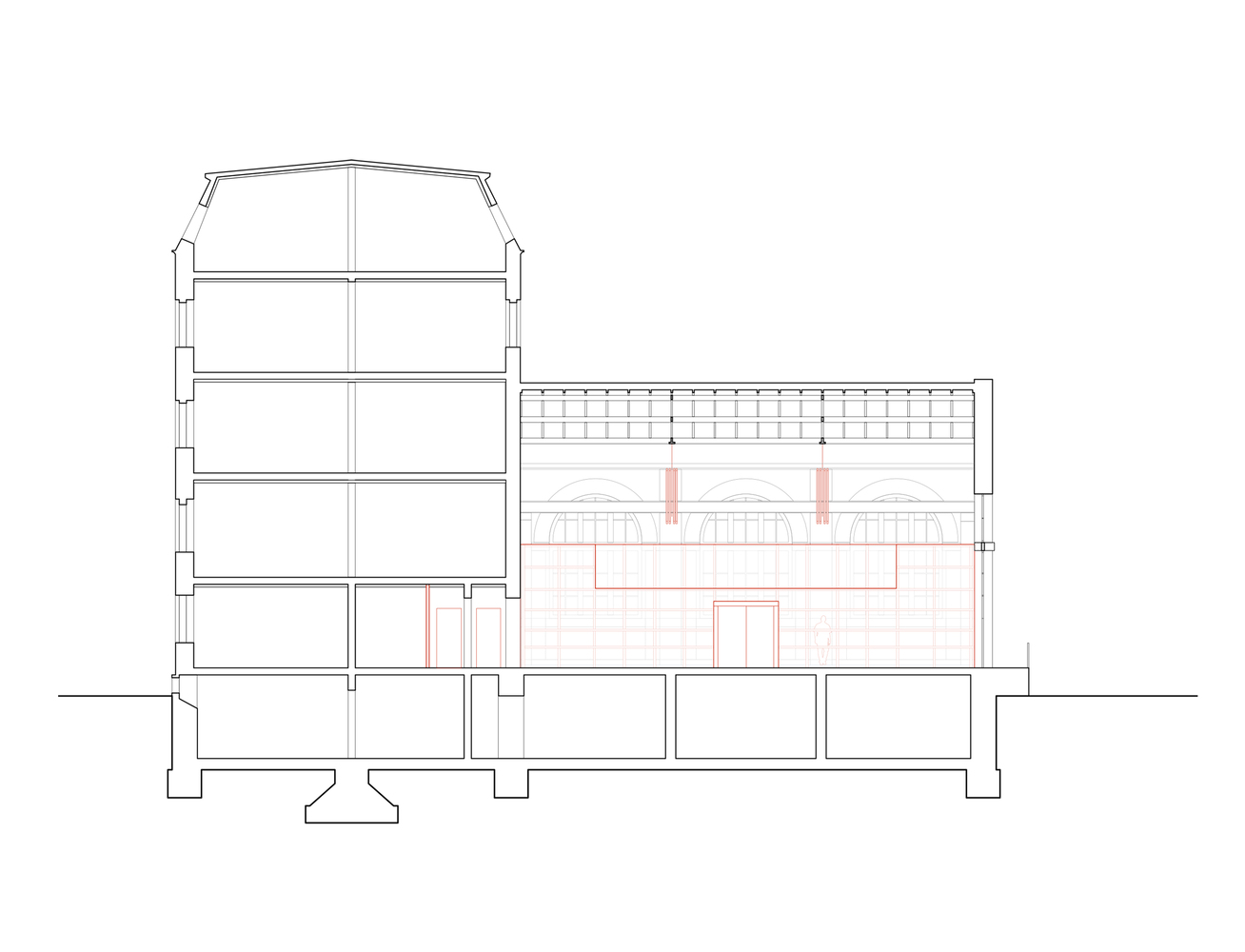 The resulting space in between serves not only as a space for encounters and a meeting point but also as a venue and passage to the adjacent front section of the building.