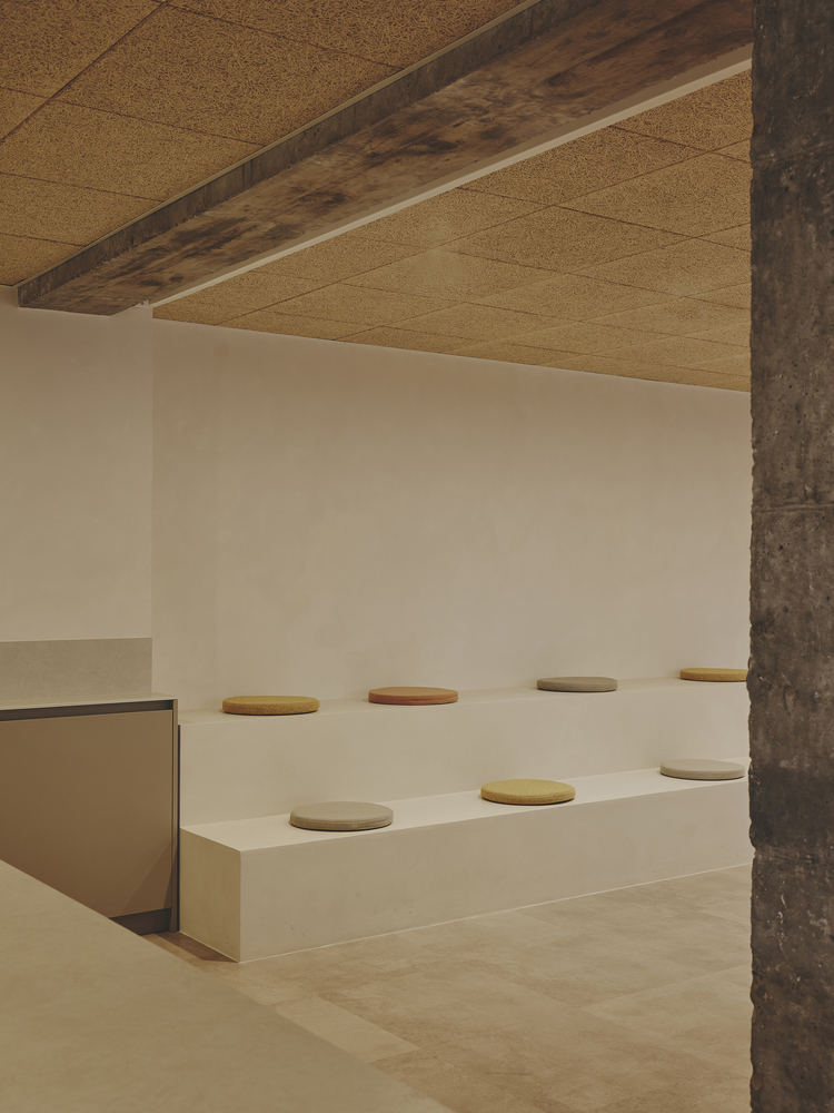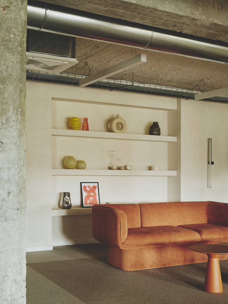 All of this cold structure, made from raw materials, is filled with eye-catching content thanks to the abundant vegetation and the choice of upholstered furniture in bold colors, such as oranges and yellows, especially in the furniture of the relaxation areas that connect the different work areas.