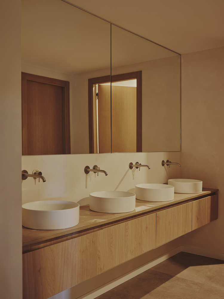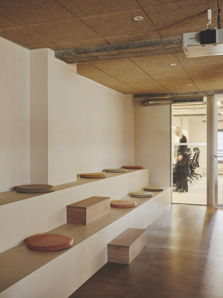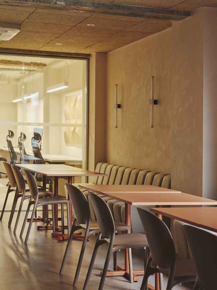 A unique space between these two wings is the large multipurpose dining room, which also serves as an auditorium for company-wide meetings thanks to a tiered seating area that runs along one side.