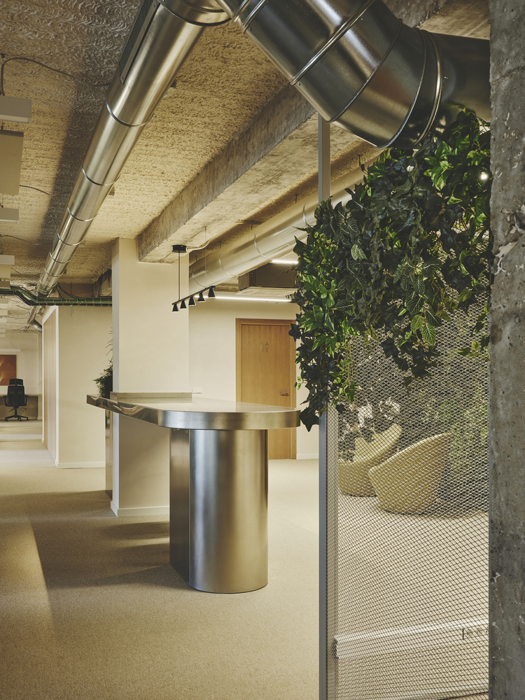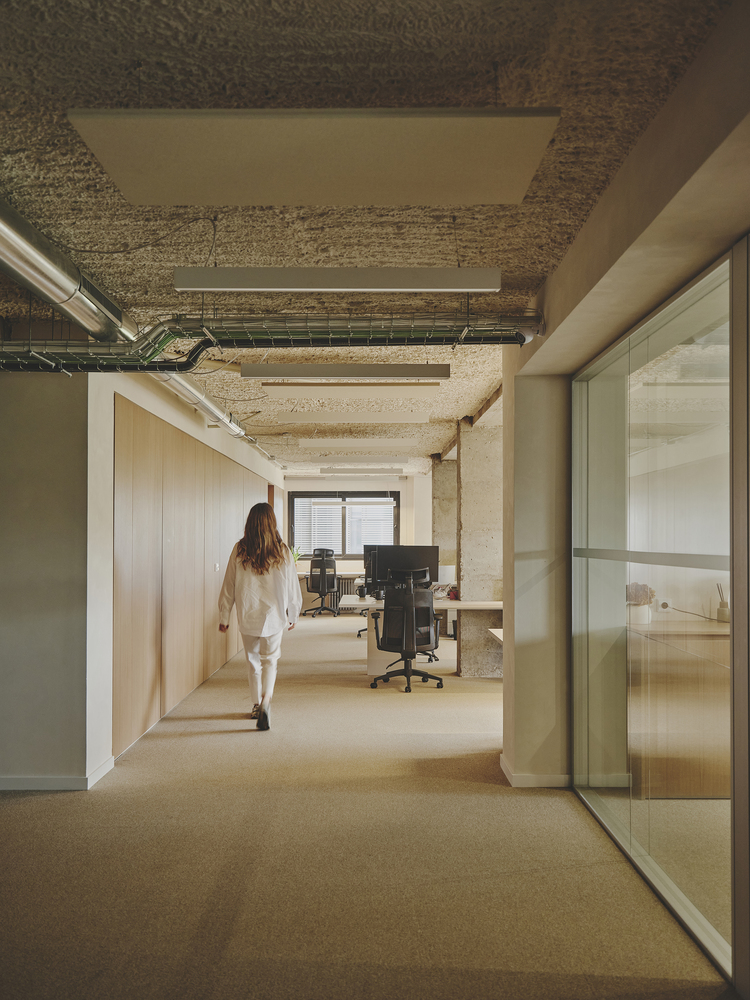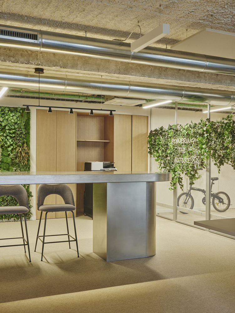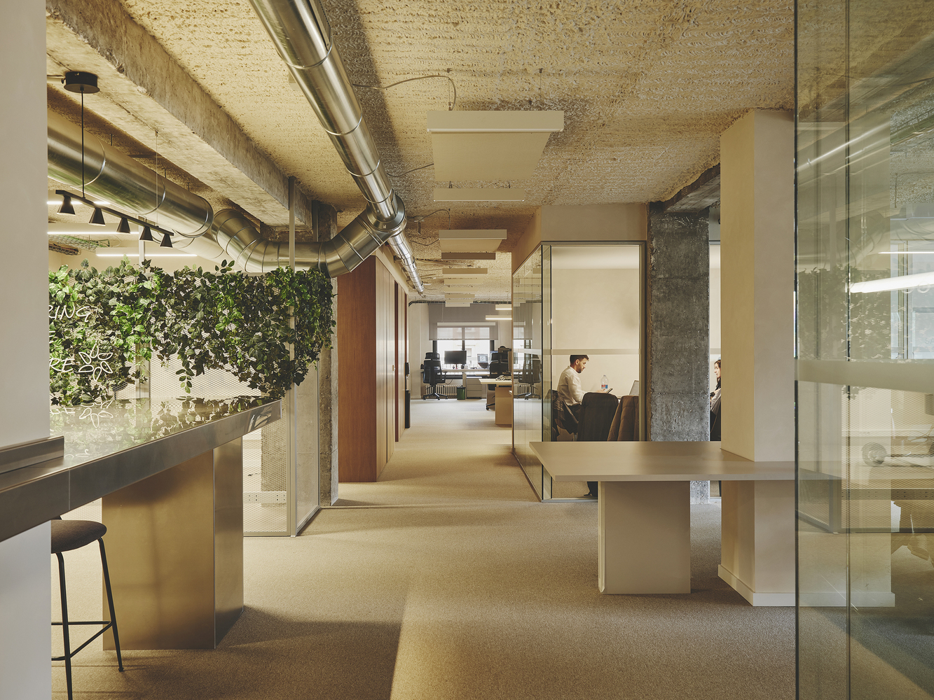 This technical solution inherently gives an aesthetic character to the offices, resulting in a youthful and technological image complemented by numerous raw materials, such as stainless steel bars, projected ceilings, or natural woods.