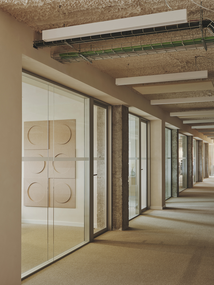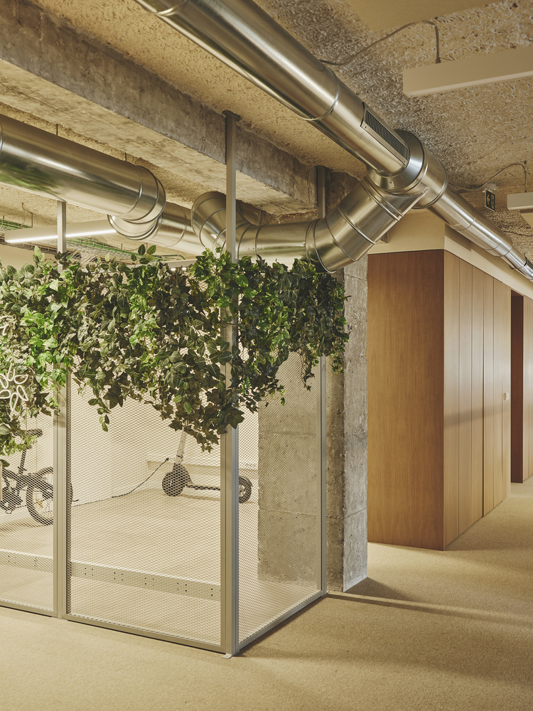 Due to the low ceiling height of the space, the installations are left exposed, whether they are air conditioning ducts, air renewal systems, or electrical and data systems.