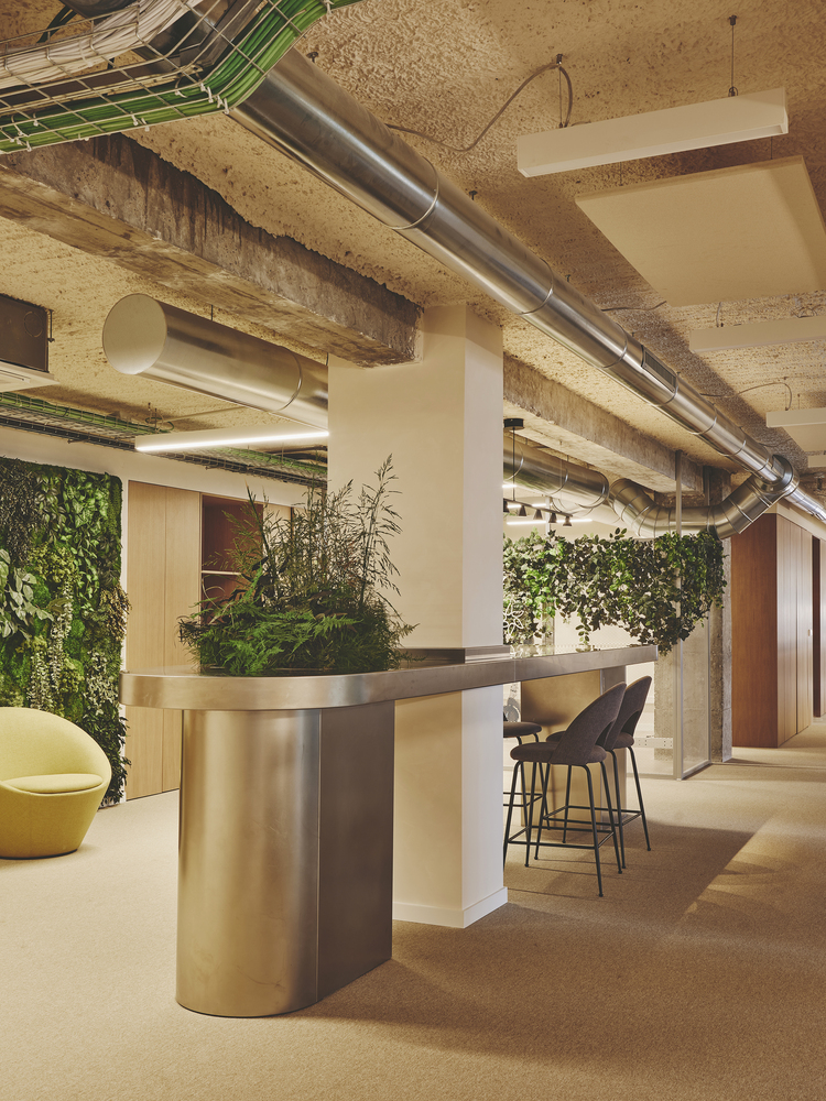 Special emphasis is placed on the choice of materials for the office's acoustics, which is very important for workspaces with such a large capacity. Carpets on the floor, rough surfaces on the ceilings and upholstery, vegetation, as well as double glazing on partitions, all contribute in this regard.