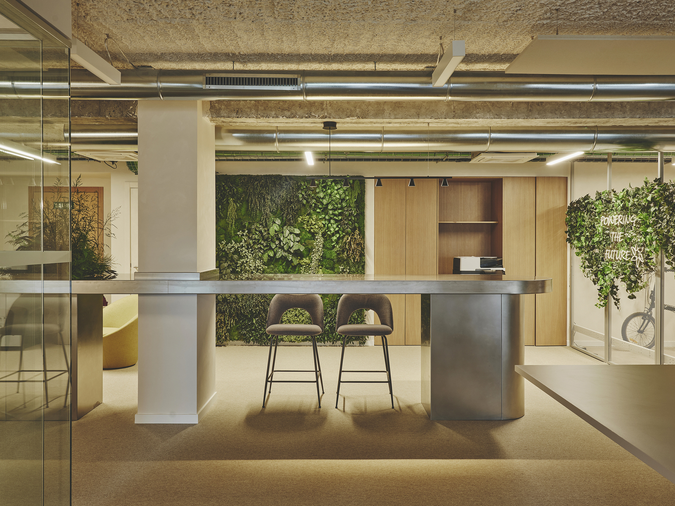 The Prosolia offices present the challenge of creating a 1,000 m2 workspace for 70 employees in a location with low ceilings and a large number of closely spaced pillars.