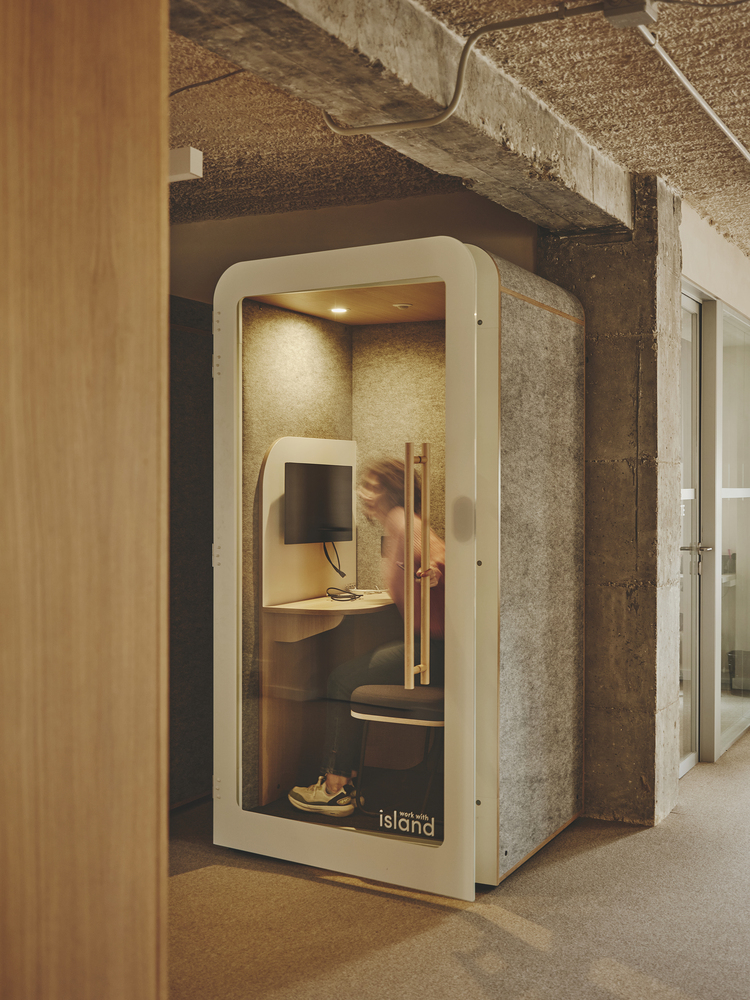 The other wing of the office houses a greater number of employees, as well as internal meeting rooms, a scooter parking area, and video call booths.