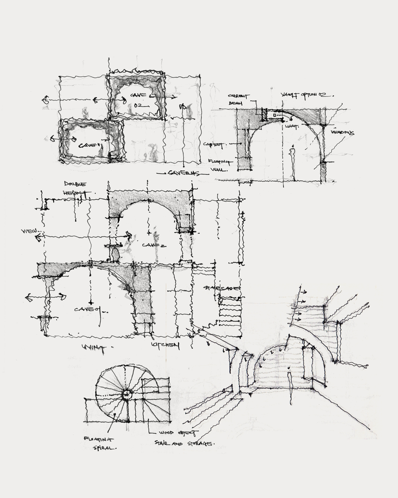 Within this sculptural composition, strategic cuts and punctures establish visual and spatial connections between the two vaulted spaces.