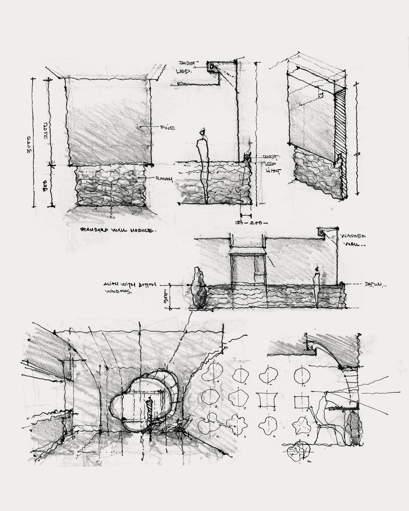 The rough, textured surfaces soften in daylight, creating a tranquil yet engaging environment.