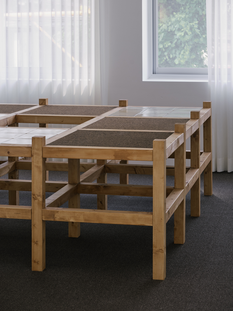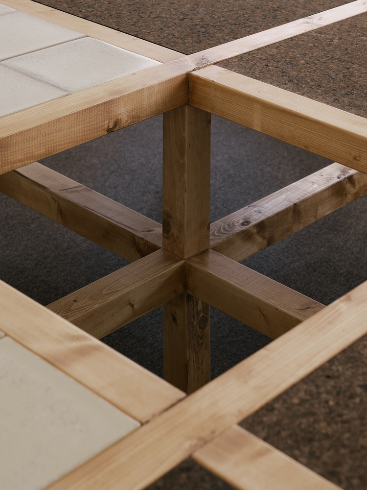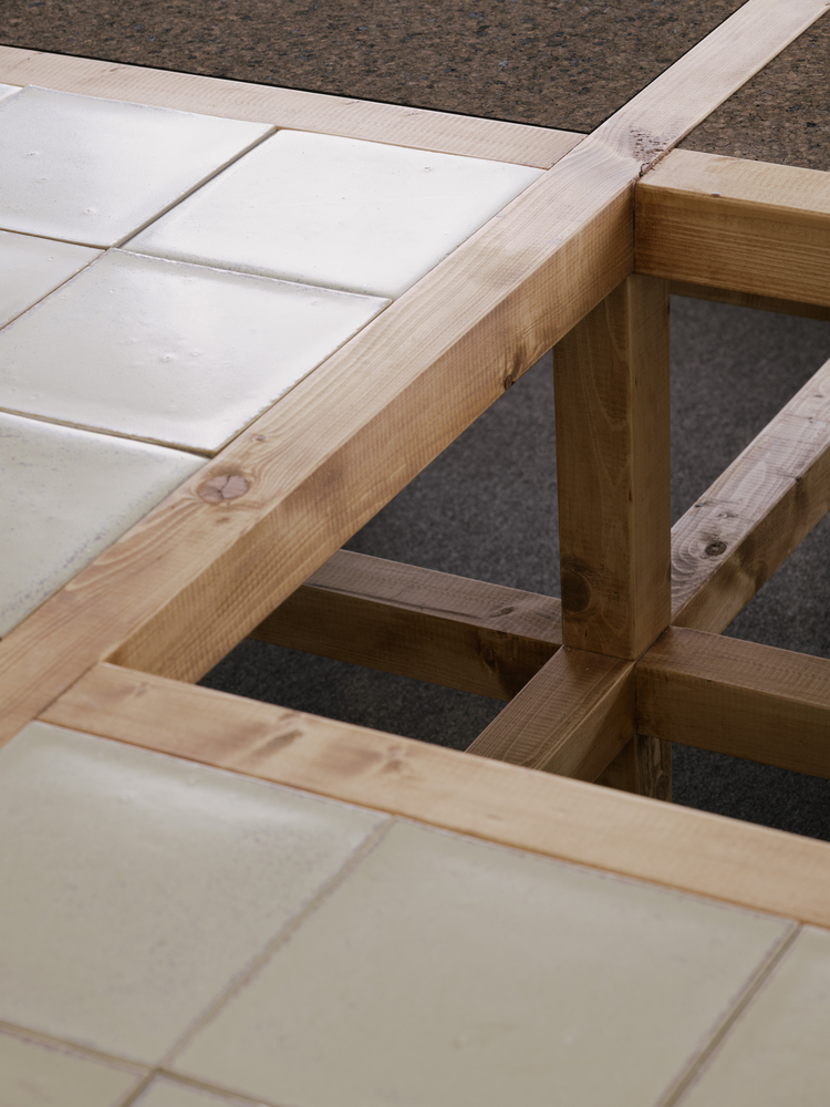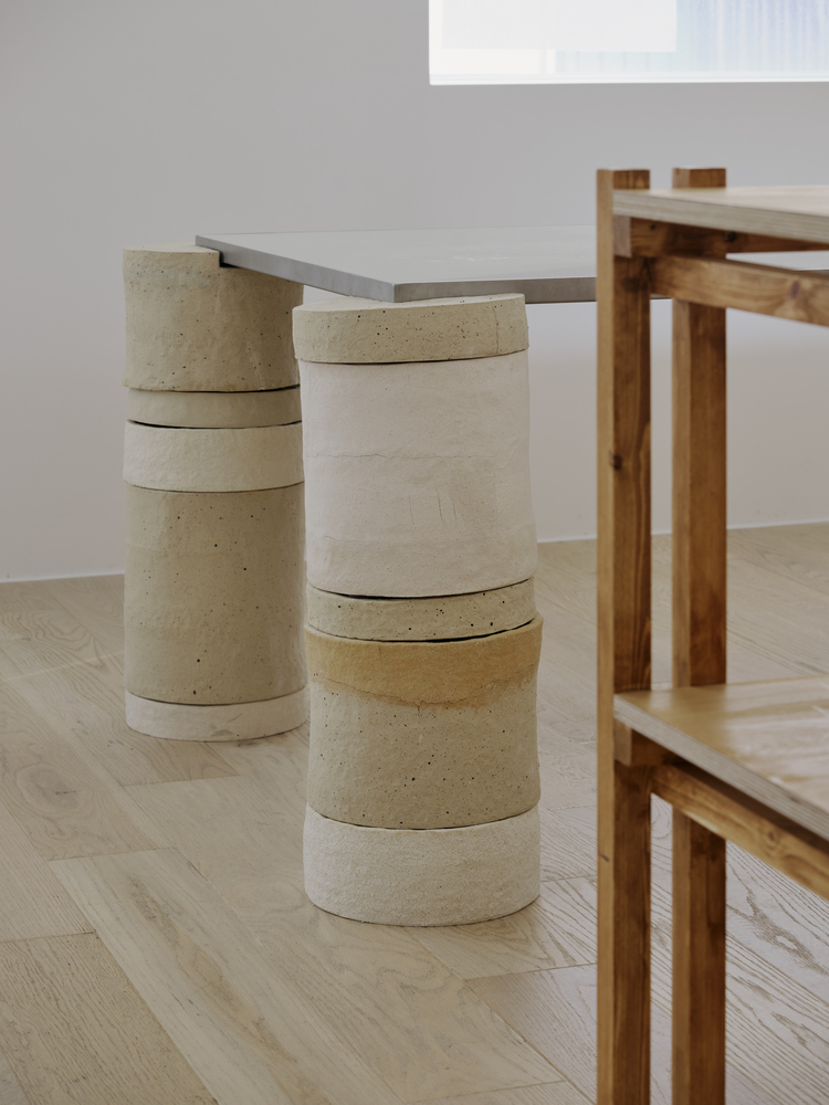 The stand with thick roots was constructed using a simple but durable binding method. The top was decorated with Insoil's handmade ceramic tiles.