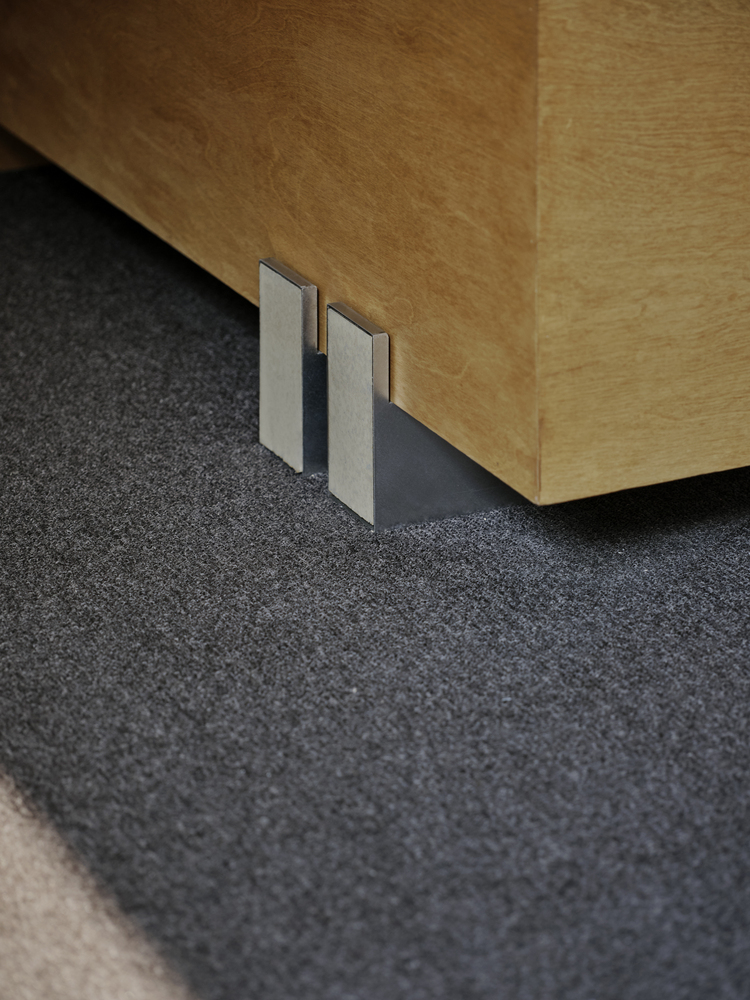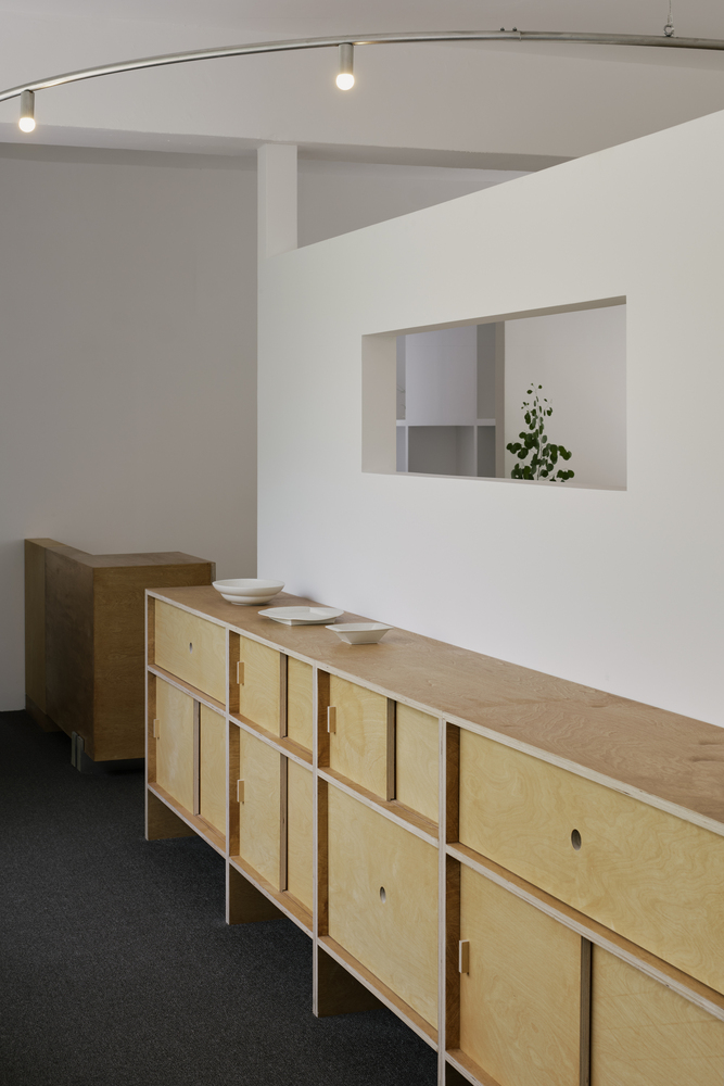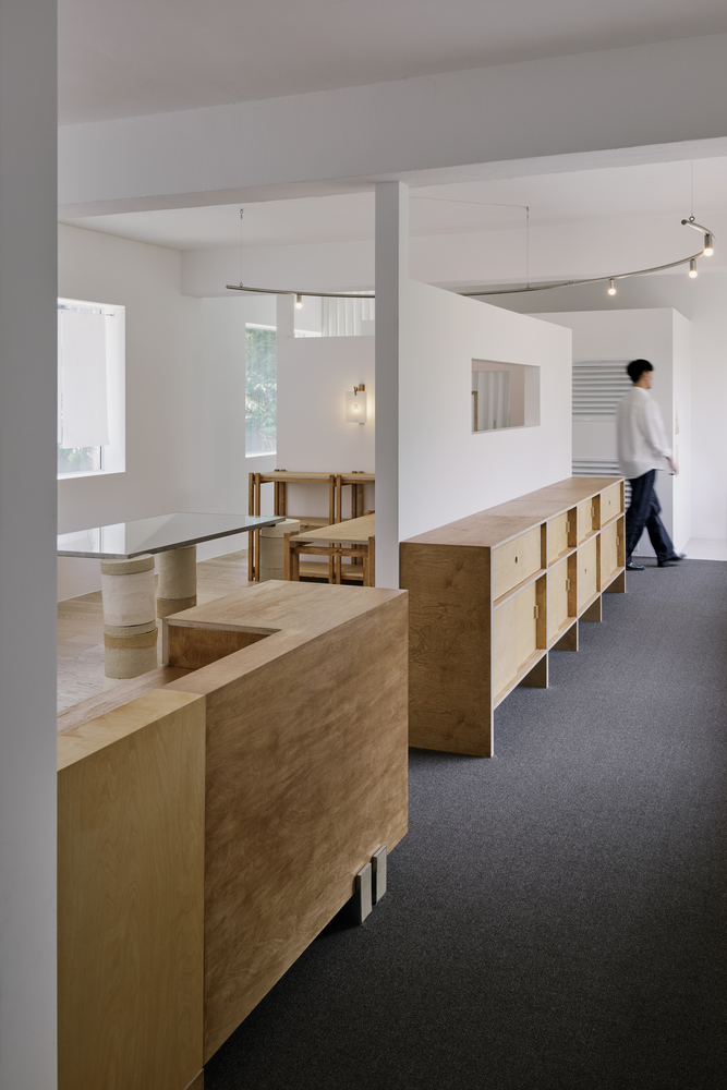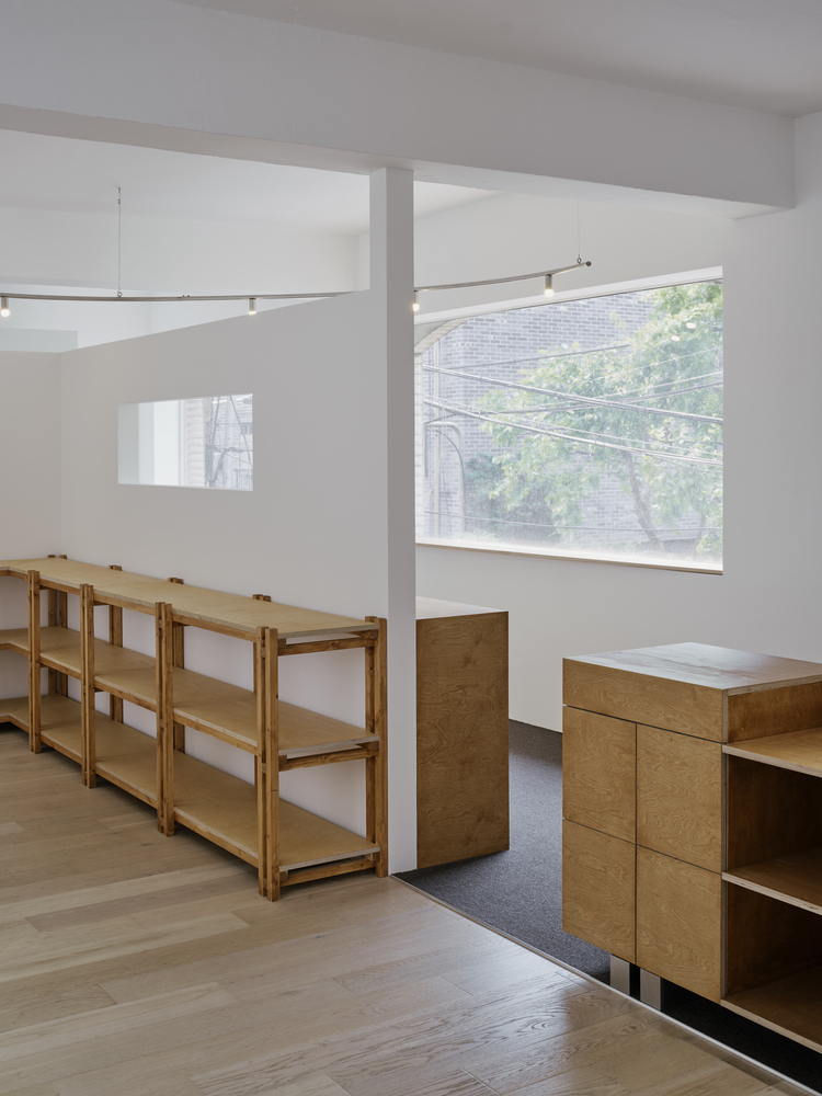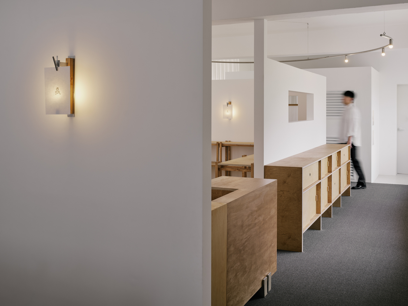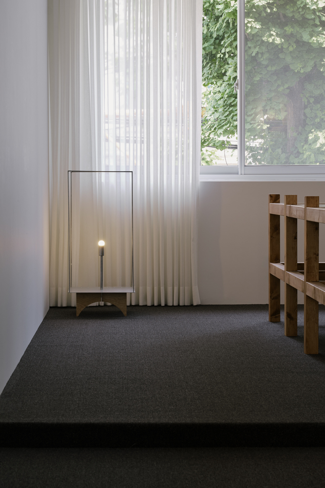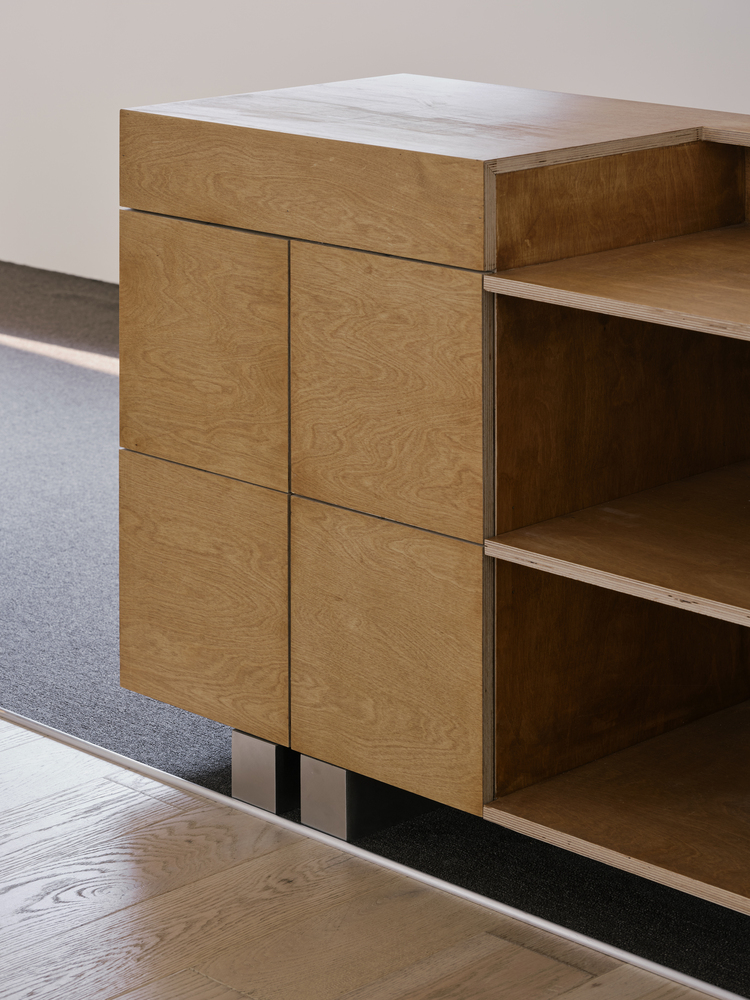 The space's main materials are birch lumber and plywood. To create a familiar yet strange scenery, the birch was colored with three types of oil stains, transforming an otherwise mundane material.