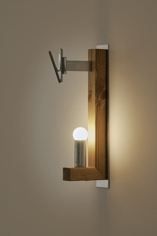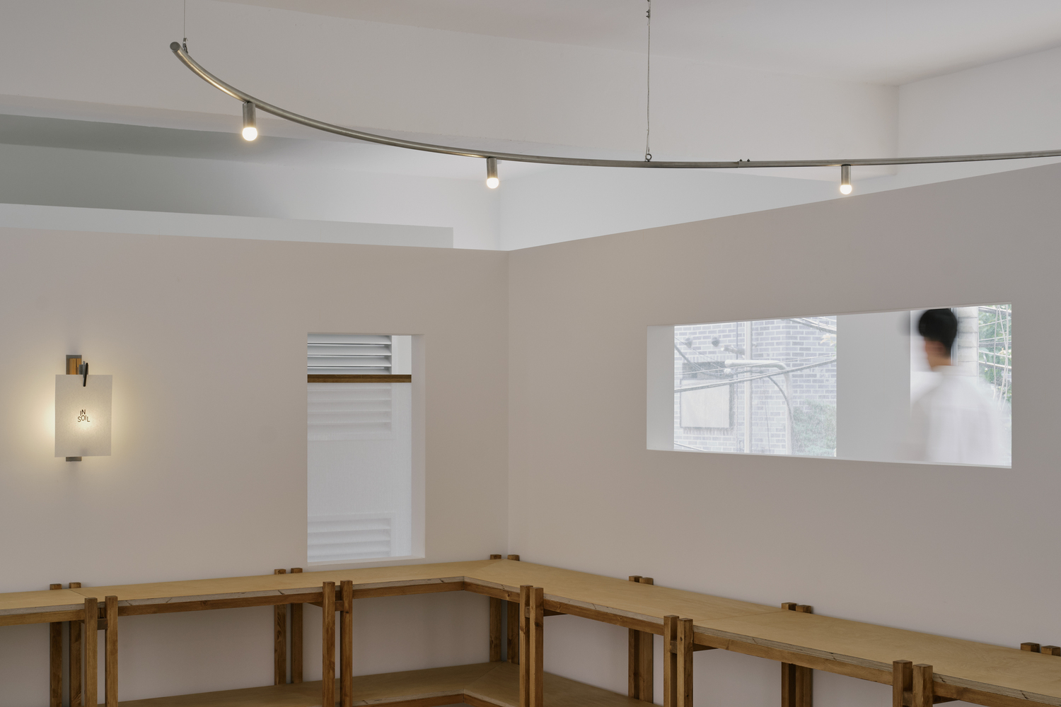 Upon first entering the space, a slightly bent shelf to the left of the entryway and a curved, metallic light fixture made of stainless steel hanging from the ceiling draw one's attention. These objects provide a tender, welcoming energy, fostering excitement about each of the disjointed areas despite being contained within a small space and encouraging movement.