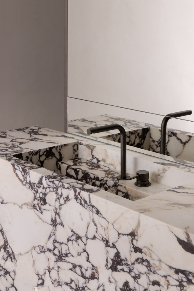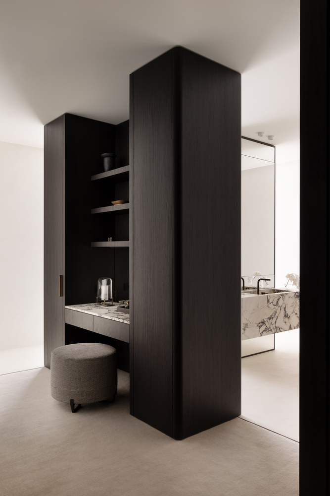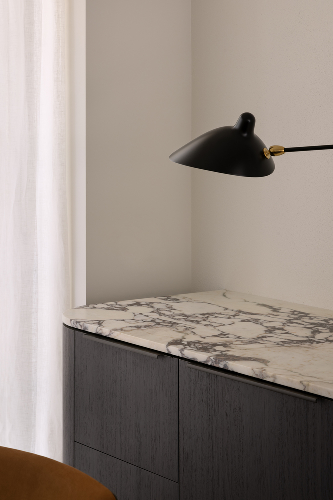 M Residence celebrates restraint and materiality, and the abundant use of Calacatta Viola underscored this. A last-minute decision to replace the heroic bathroom vanity with marble over travertine ensured an elegant and balanced space, culminating in a cohesive design with functional elements.