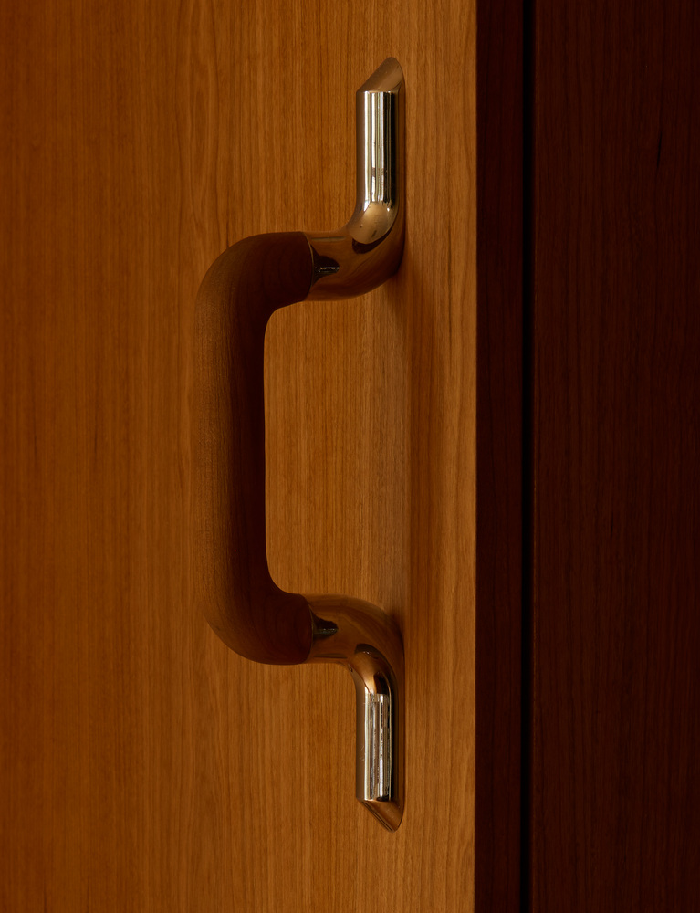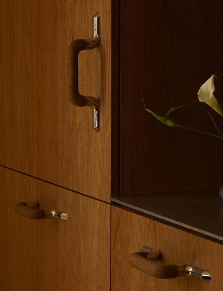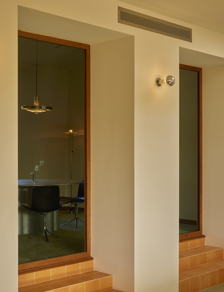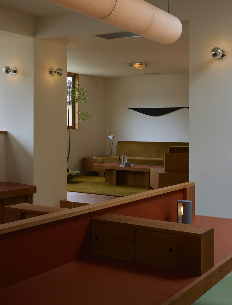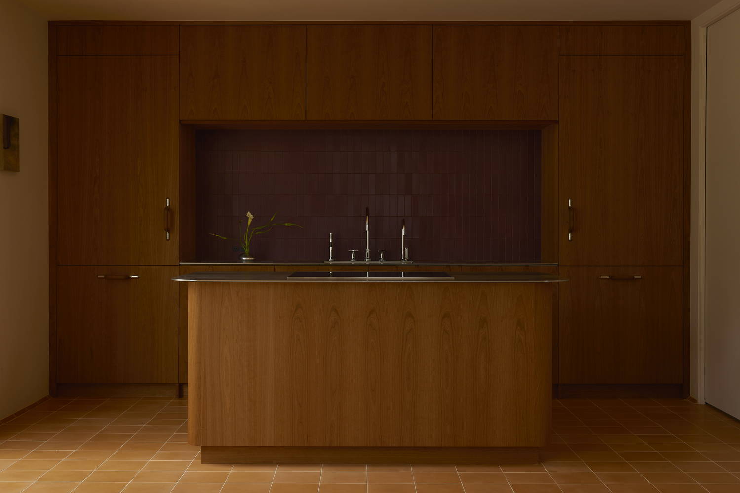 Every material and detail tells part of the story: cherry-wood paneling lends warmth against the green concrete flooring; stainless steel countertops - a 22RE signature - meet orange cement tiles paired with Heath Ceramics backsplash in the kitchen.