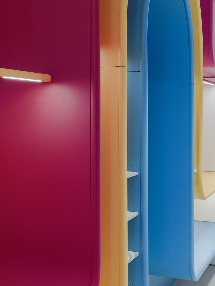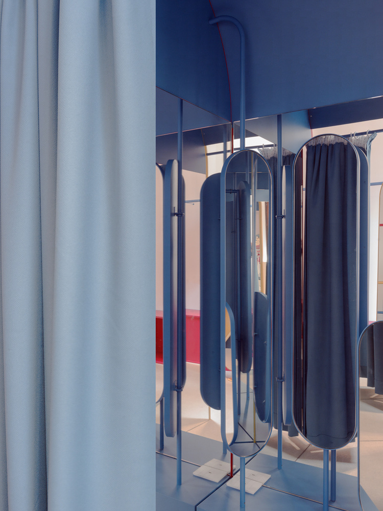 These hues were applied to both the walls and the custom-designed furniture, which is characterized by tubular metal and wood components that shape and define the shop's spatial organization.