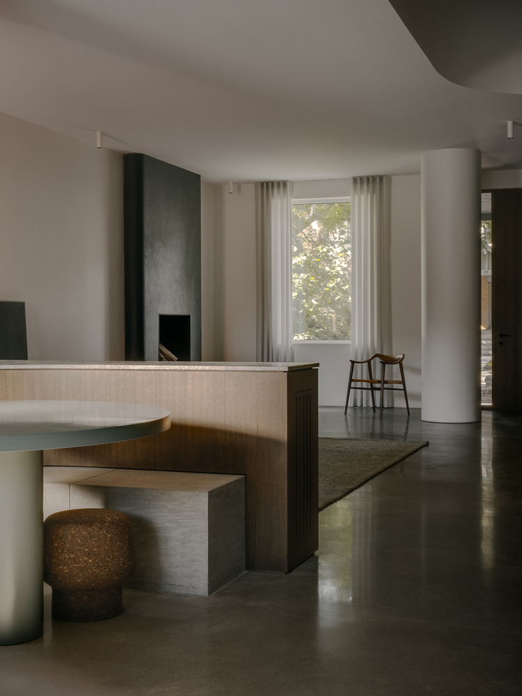 Designed for entertaining, the ground floor unfolds as a series of fluid yet discrete zones. A tactile palette of concrete, wood, stone, and plaster unifies the spaces, while sight lines, angles, and curves carve volumes, reflect light, and shape movement.