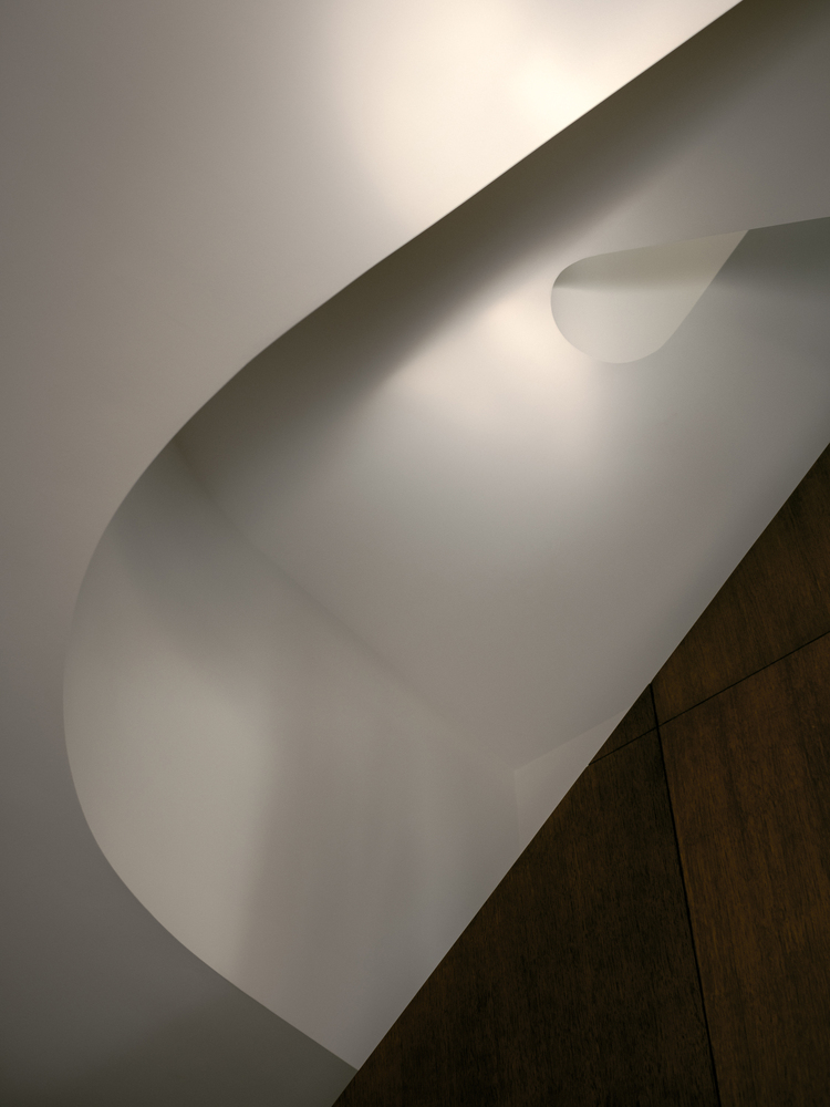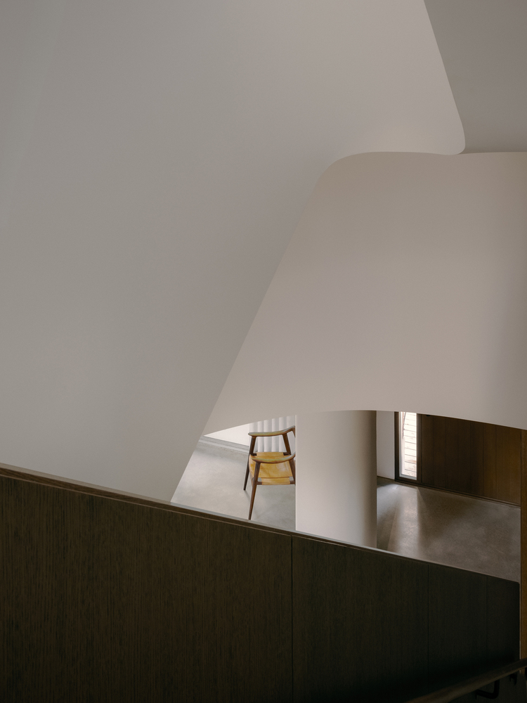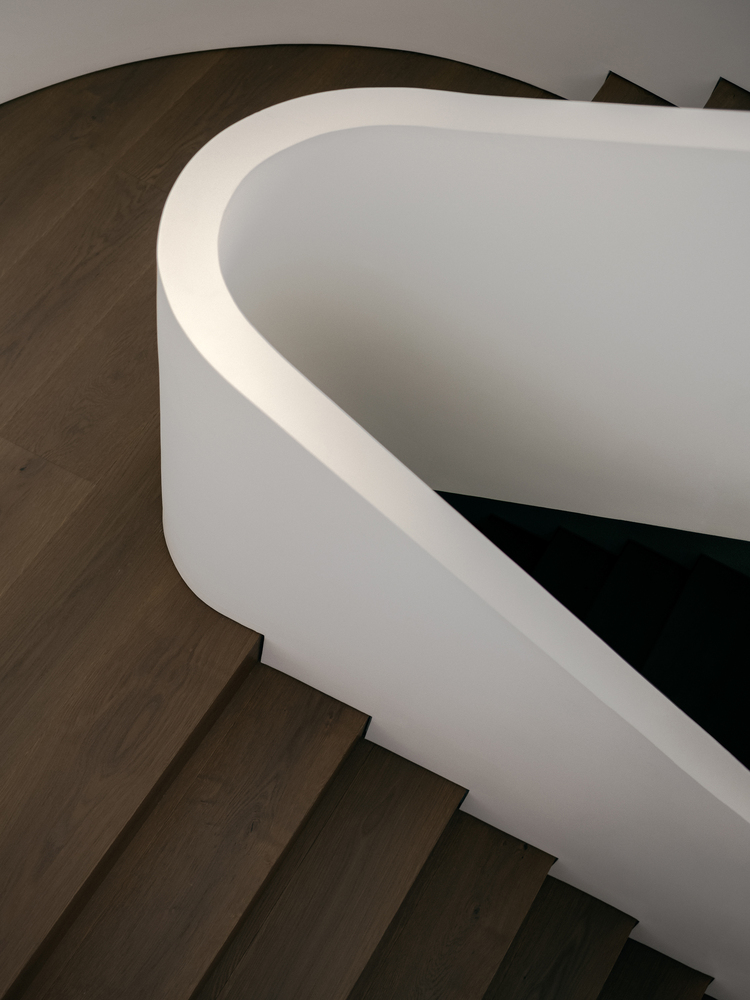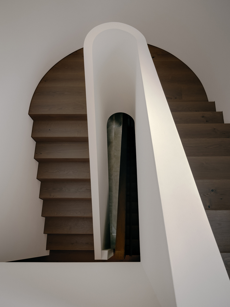 A rounded ceiling cut hints at the staircase's transformation above, where it becomes a light, curvaceous form drawing daylight from an east-facing third-floor window.