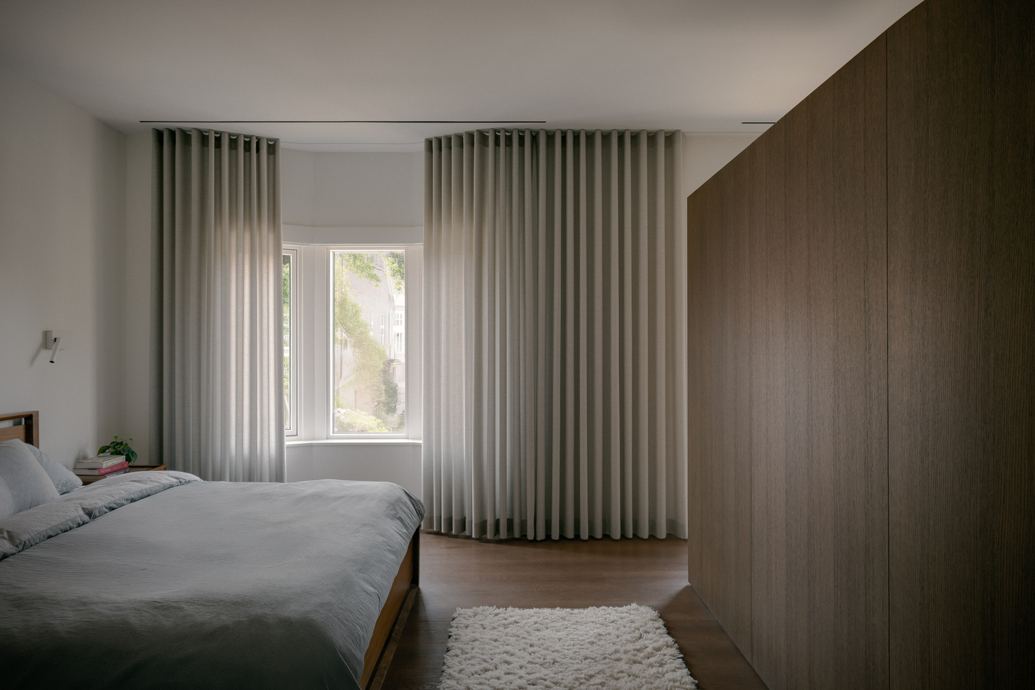 The second floor houses a forest-green library with custom millwork and a built-in bench. In the primary bedroom, a monumental freestanding walk-in closet, crafted entirely from wood and designed to stop short of the ceiling, acts as a sculptural room divider.