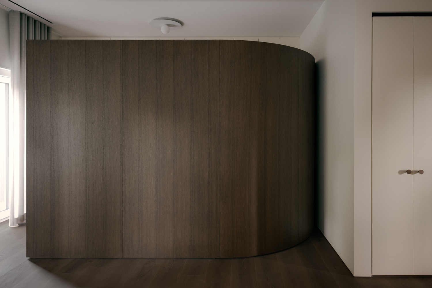 Geometric interventions often serve multiple roles. A curved partition wall divides the living and kitchen areas, conceals ductwork, backs the dining booth, and integrates with cabinetry as a serving surface.