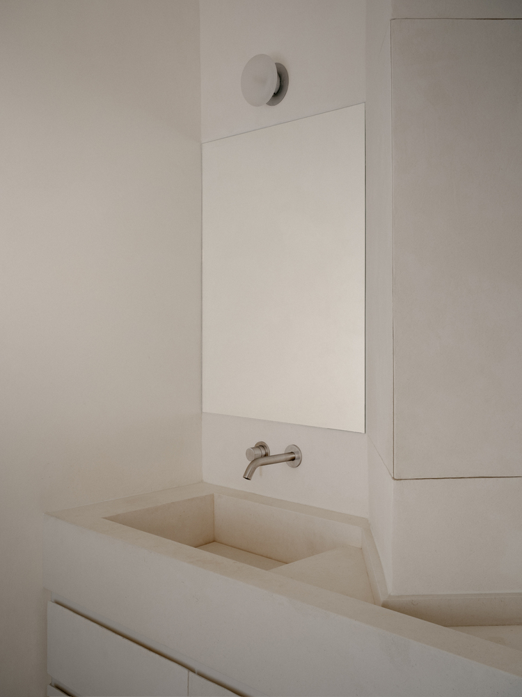 The ensuite's pill-shaped shower and vanity are finished in plaster, integrating seamlessly with the rest of the bathroom.