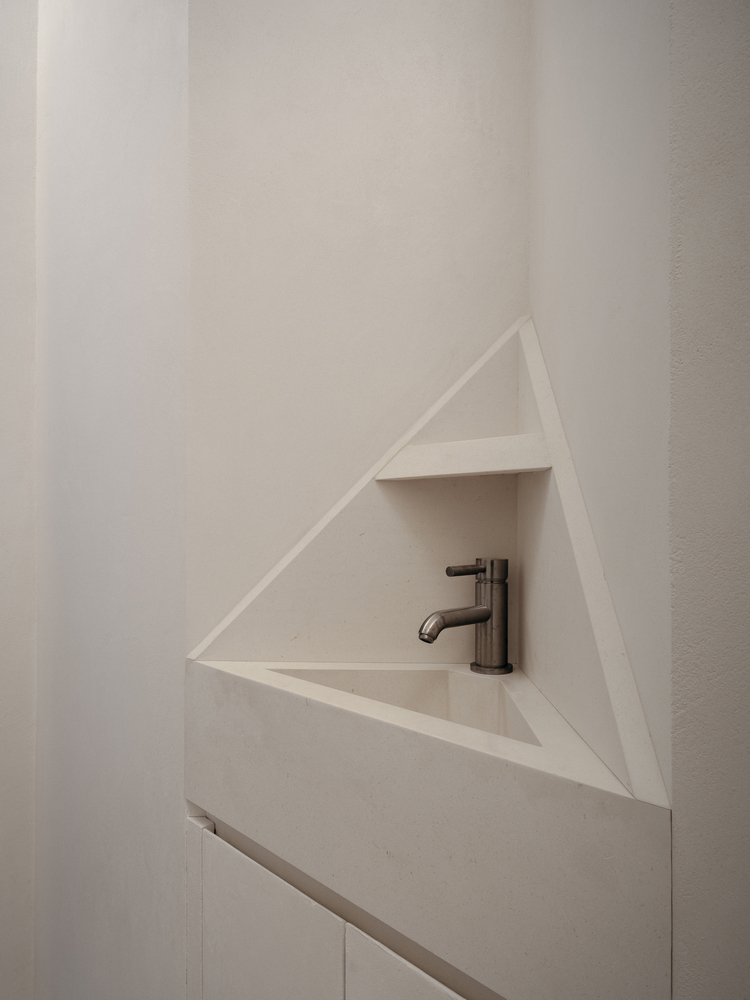 The ensuite bathroom and powder room engage in an interlocking geometric dialogue: a triangular flush-mounted sink in the powder room finds its counterpart in a triangular column dividing the vanity in the ensuite.