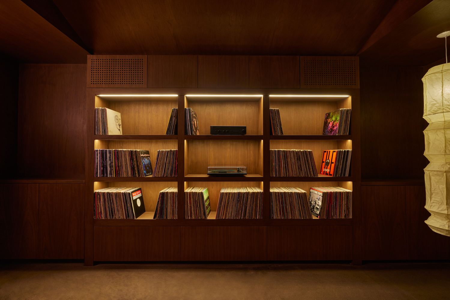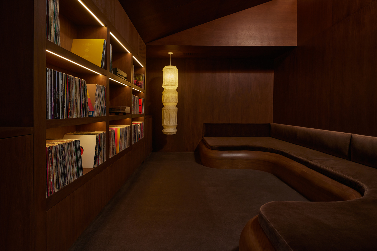 The conference room pairs a burl wood Deco-inspired table with Pierre Jeanneret chairs, while the listening room is enveloped in walnut and velvet, built for horizontal listening sessions on a six-foot custom sofa beneath a large Akari floor lamp.