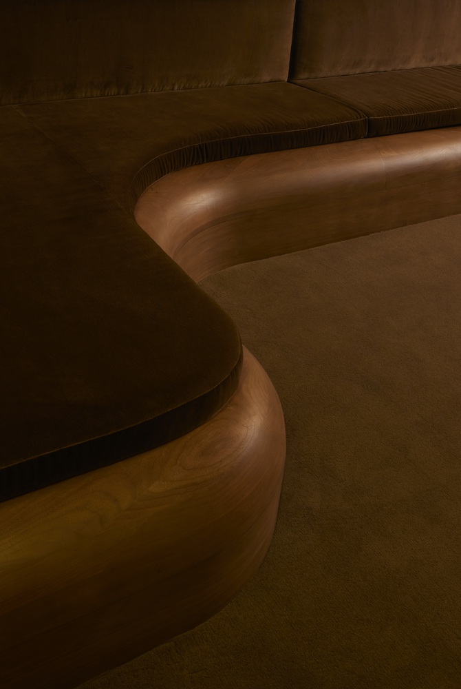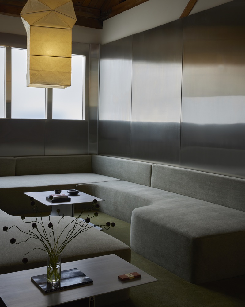 Lined with stainless steel and finished with deep green mohair couches and plush carpeting, the room channels a retro sensibility while remaining contemporary.