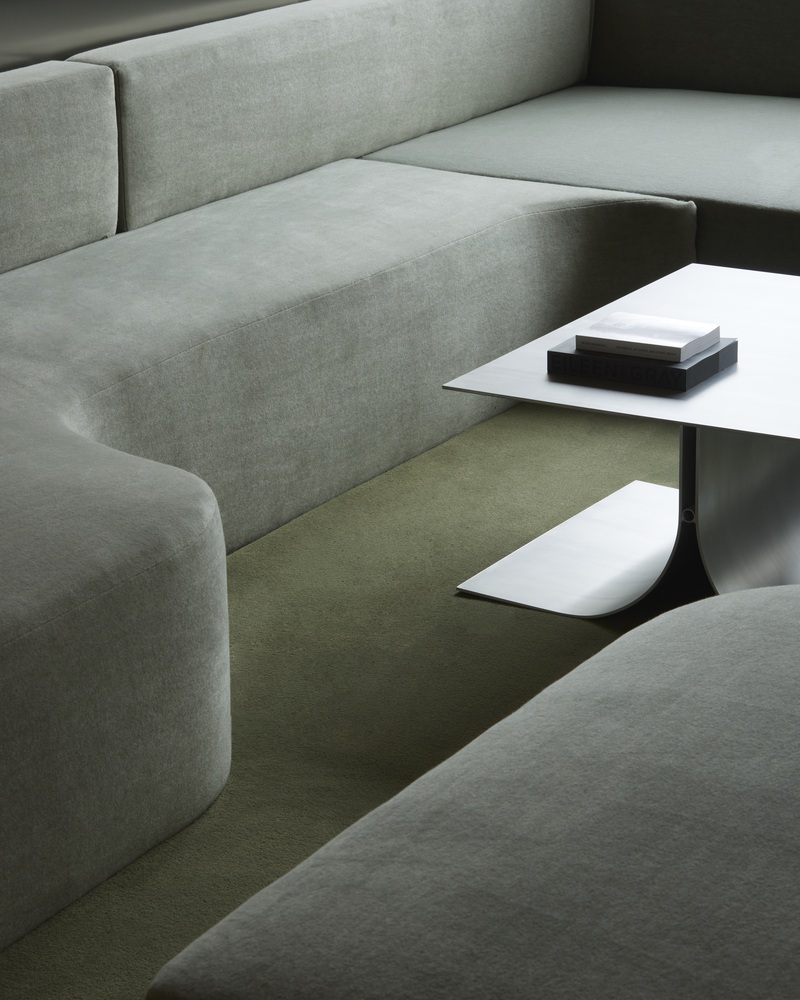 The space's mix of soft and hard surfaces, rich textiles, and cool metals is emblematic of the larger material language found across the office.