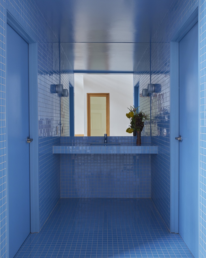 A vivid blue bathroom tiled in three-inch Japanese ceramic provides a final, unexpected moment of visual surprise.
