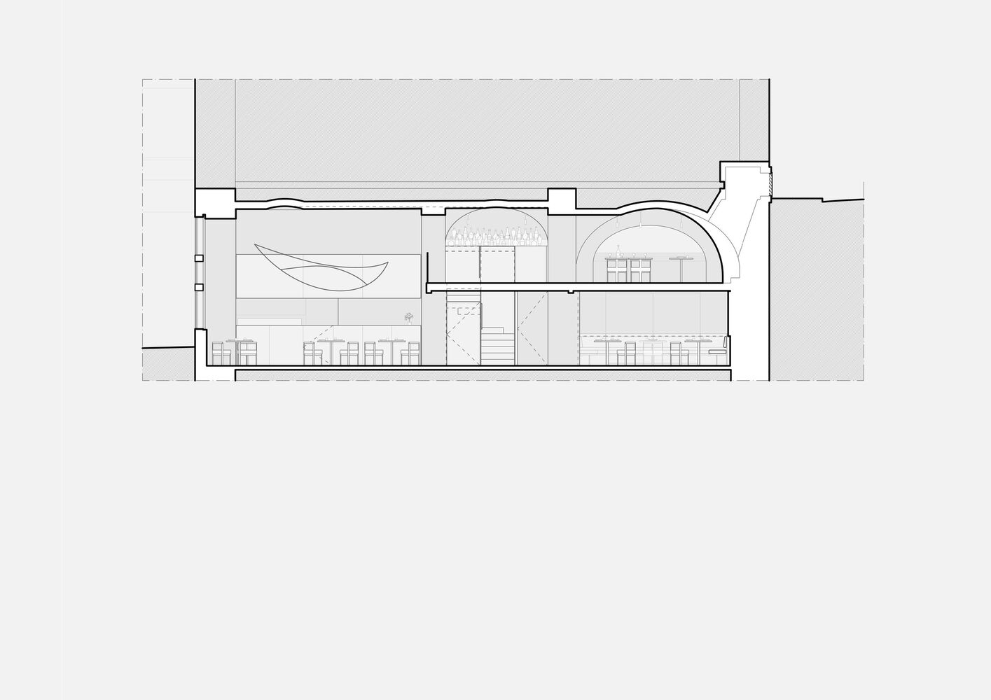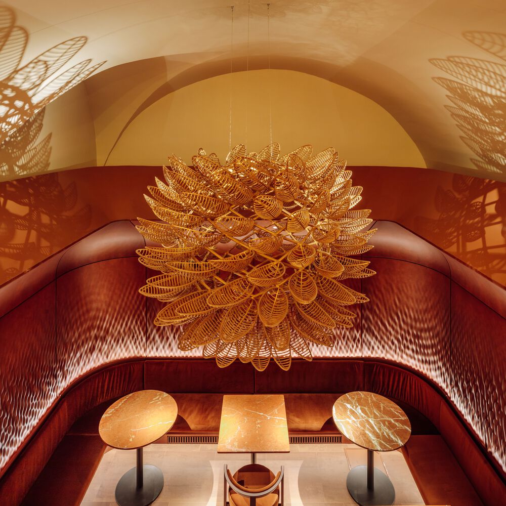 Their brief involved the transformation of a barren, vault-like interior characterised by domed structures into an enveloping, warm and sophisticated dining atmosphere.