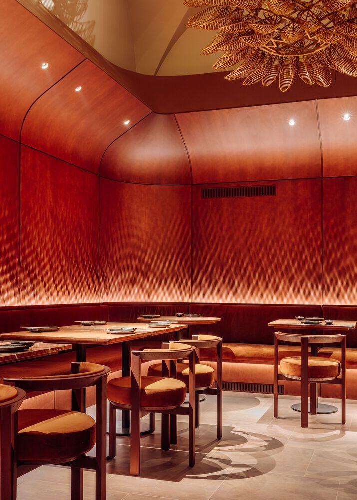 The restaurant’s signature space, known as the ‘cocoon room’, immerses visitors in an undulating, internal landscape of rippling forms and natural textures. he room is panelled throughout with woodwork produced by MtWoods.