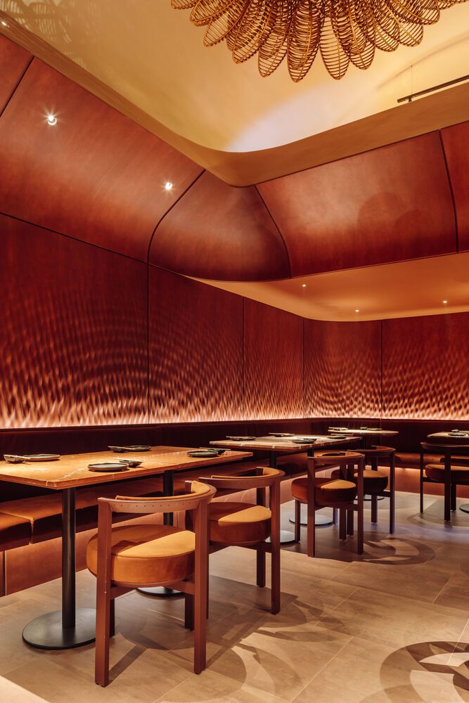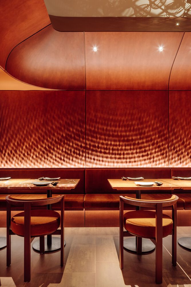 The restaurant’s round tables and minimalist chairs have been custom designed by Spacegram, the latter using velvet upholstery in a vintage gold colour.