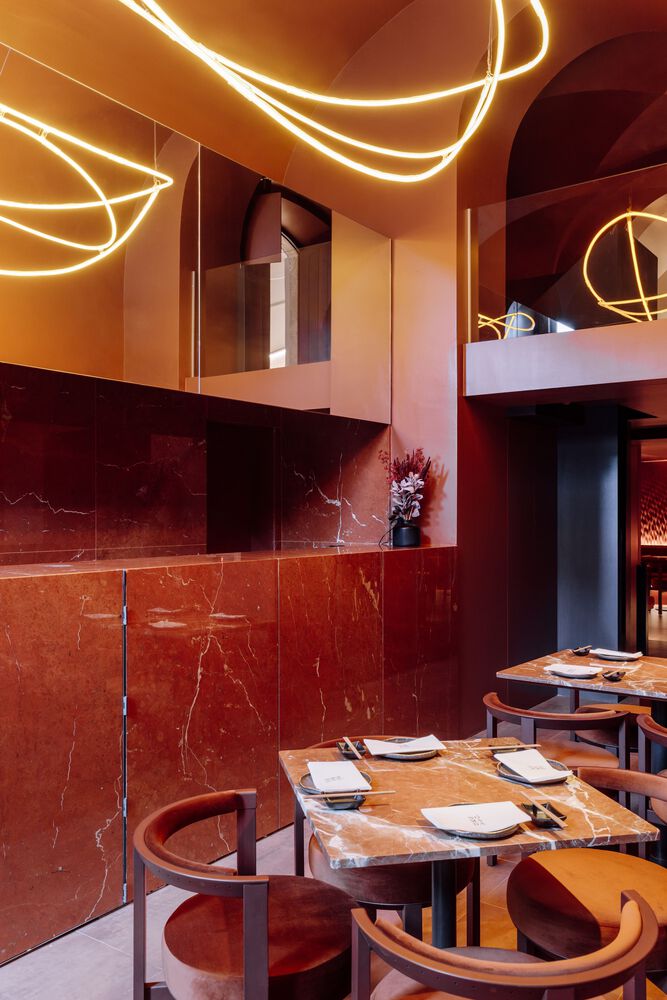 The variety of texture across the distinct spaces is reflected in strategically positioned mirrors, each punctuating and elongating the restaurant’s unique internal journey.