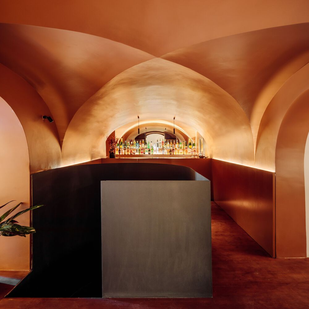 The first main space, which is taken up by the restaurant’s entrance and bar, draws visitors in through a tunnel, revealing a soft glow of muted light, simulating the ambience of a summer night. The tunnel leads to a cocktail bar and spiral staircase, each built from bespoke metal structures, with the staircase leading visitors to a lower dining level.