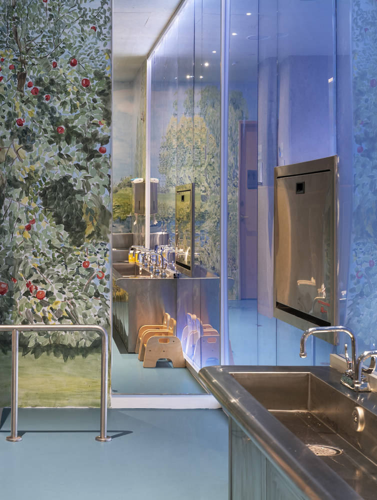 The Children's Restroom, illuminated by a blue translucent wall and fitted with custom fixtures that enable them to wash and flush on their own, is strategically positioned as a pivotal space in the child's development.