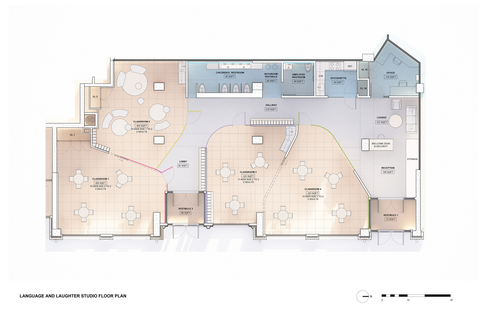 The four classrooms are conceived as Vessels of Light defined by translucent, colorful, curved screens animated by the storefront's abundant sunlight.