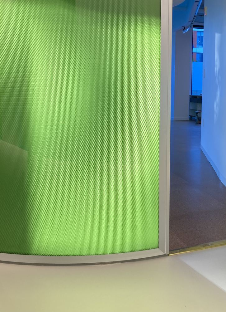 Light infuses the spaces with immersive color through translucent polychromatic walls made of 100% recycled acrylic.