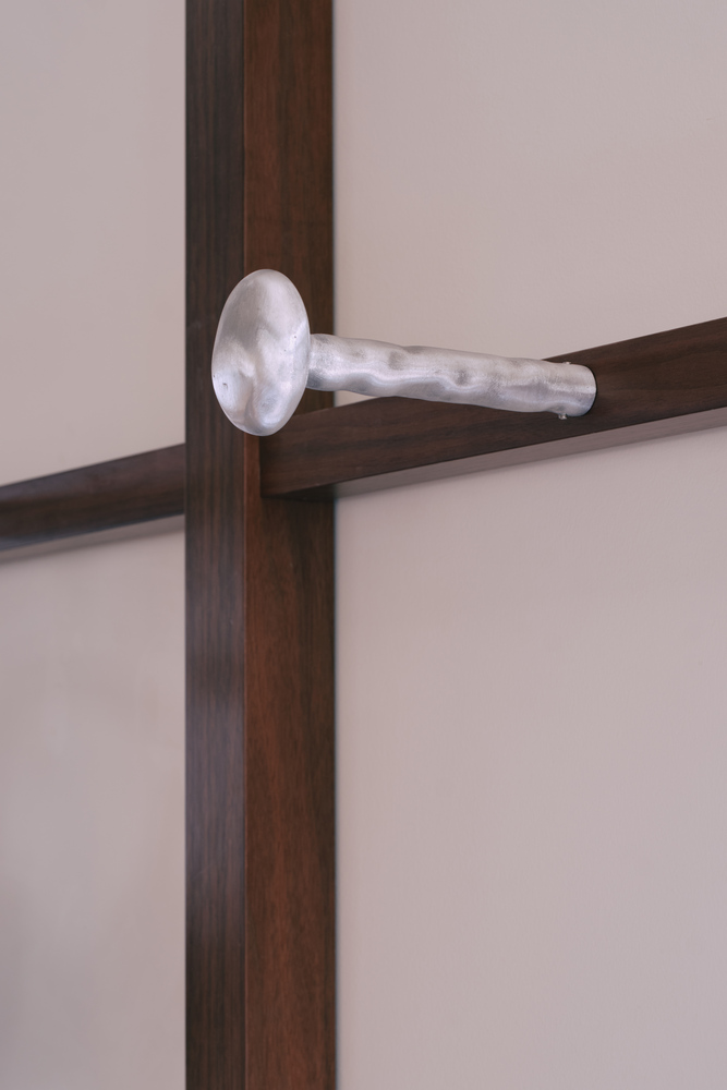 To refine the typical lingerie display, which can appear cluttered or overly exposed, the design employs cork panels and cast-metal hooks, framing each piece like an exhibit.