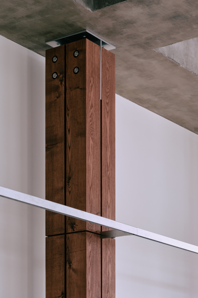 The continuity of this column system connects both floors, defining a consistent architectural rhythm.