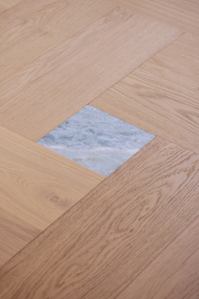 A pinwheel-patterned oak floor with sky-blue marble inlays adds warmth and symbolic depth, balancing craft and modern precision.